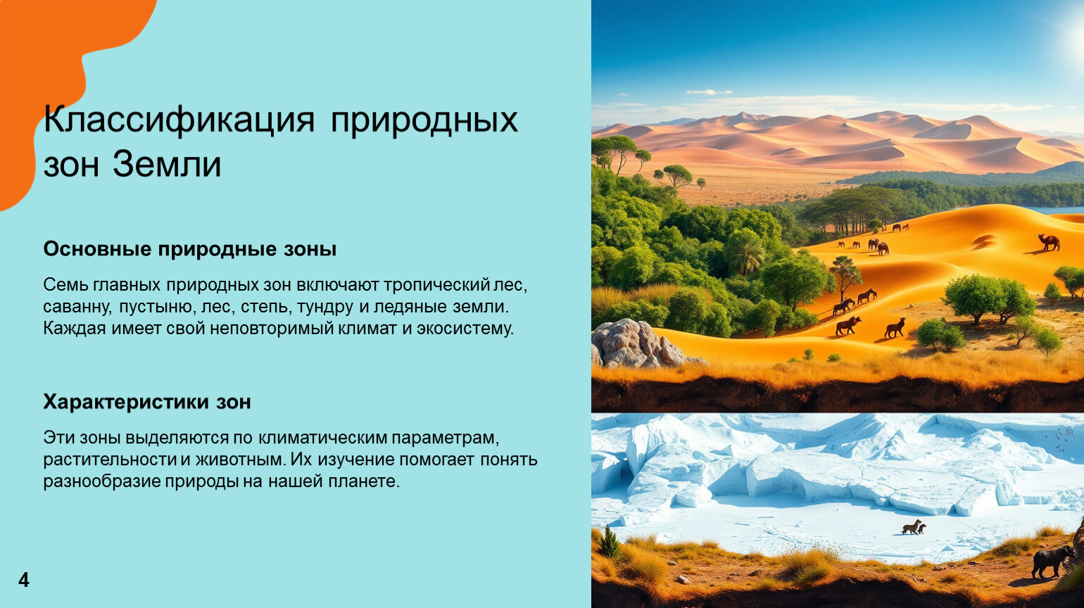 Классификация природных зон Земли Основные природные зоны Семь главных природных зон включают тропический лес, саванну, пустыню, лес, степь, тундру и ледяные земли. Каждая имеет свой неповторимый климат и экосистему. Характеристики зон Эти зоны выделяются по климатическим параметрам, растительности и животным. Их изучение помогает понять разнообразие природы на нашей планете.