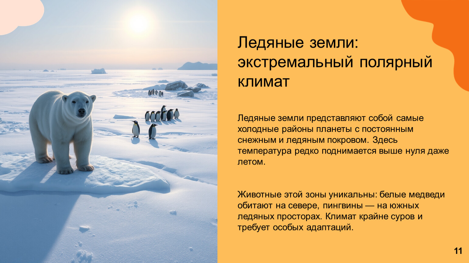 Ледяные земли: экстремальный полярный климат Ледяные земли представляют собой самые холодные районы планеты с постоянным снежным и ледяным покровом. Здесь температура редко поднимается выше нуля даже летом. Животные этой зоны уникальны: белые медведи обитают на севере, пингвины — на южных ледяных просторах. Климат крайне суров и требует особых адаптаций.