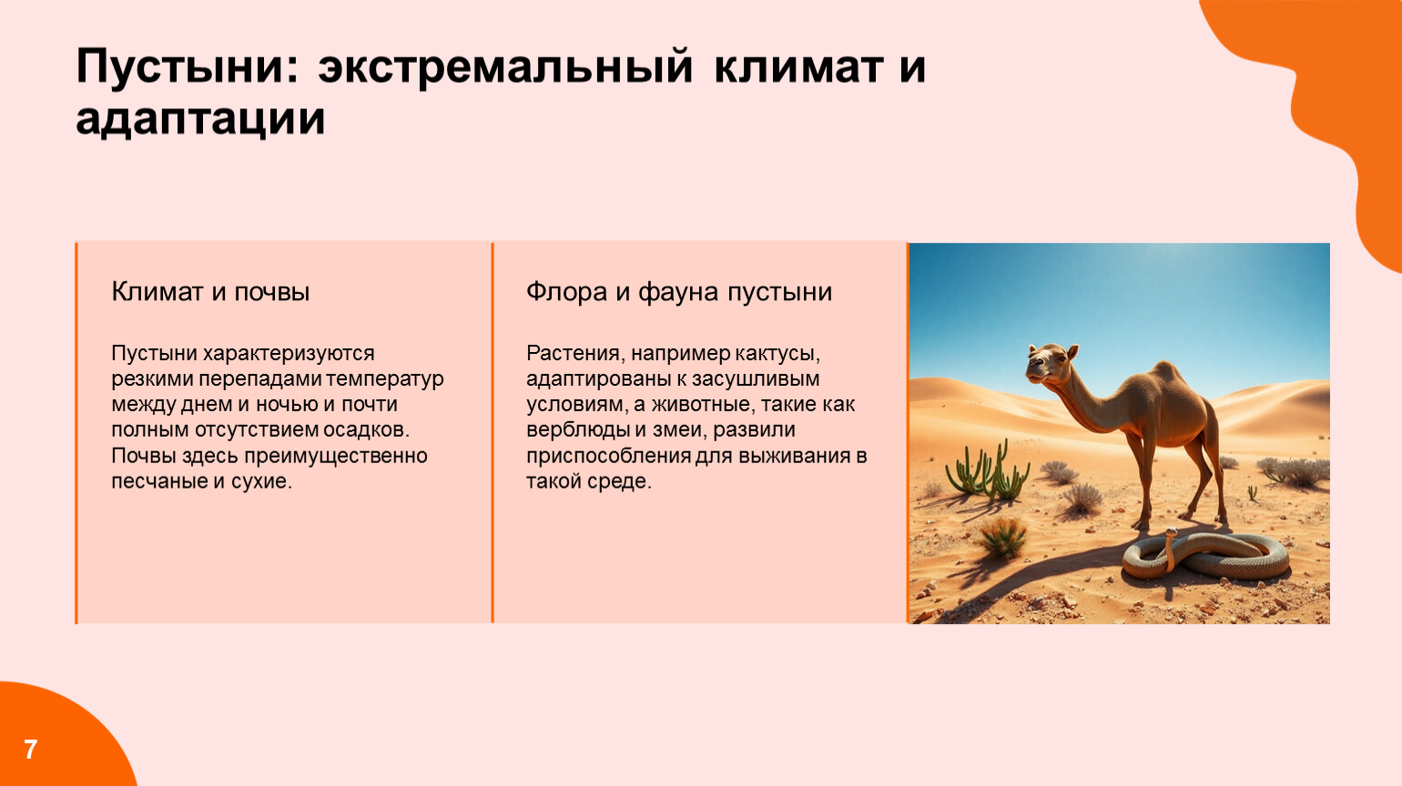 Флора и фауна пустыни Растения, например кактусы, адаптированы к засушливым условиям, а животные, такие как верблюды и змеи, развили приспособления для выживания в такой среде.
