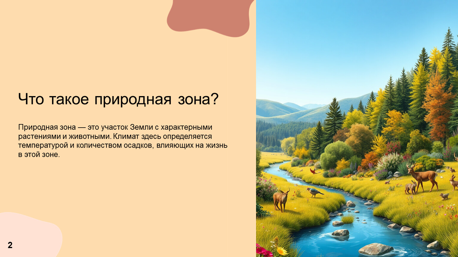 Что такое природная зона? Природная зона — это участок Земли с характерными растениями и животными. Климат здесь определяется температурой и количеством осадков, влияющих на жизнь в этой зоне.