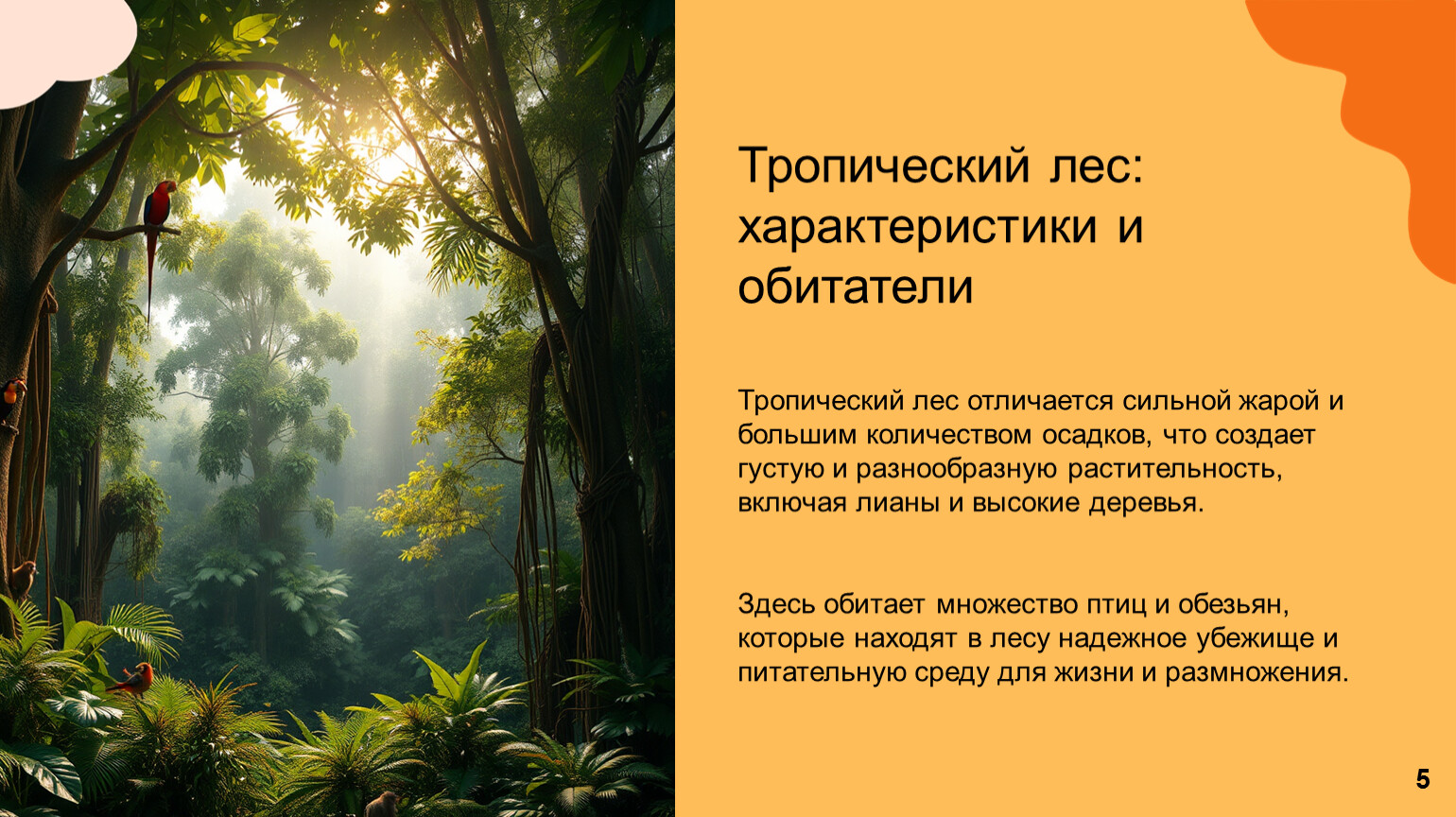 Тропический лес: характеристики и обитатели Тропический лес отличается сильной жарой и большим количеством осадков, что создает густую и разнообразную растительность, включая лианы и высокие деревья. Здесь обитает множество птиц и обезьян, которые находят в лесу надежное убежище и питательную среду для жизни и размножения.