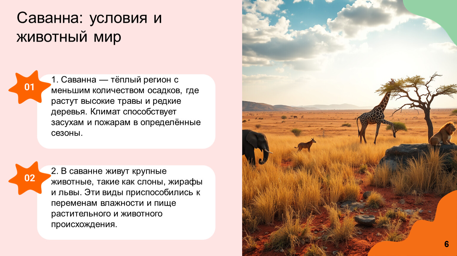 1. Саванна — тёплый регион с меньшим количеством осадков, где растут высокие травы и редкие деревья. Климат способствует засухам и пожарам в определённые сезоны.
