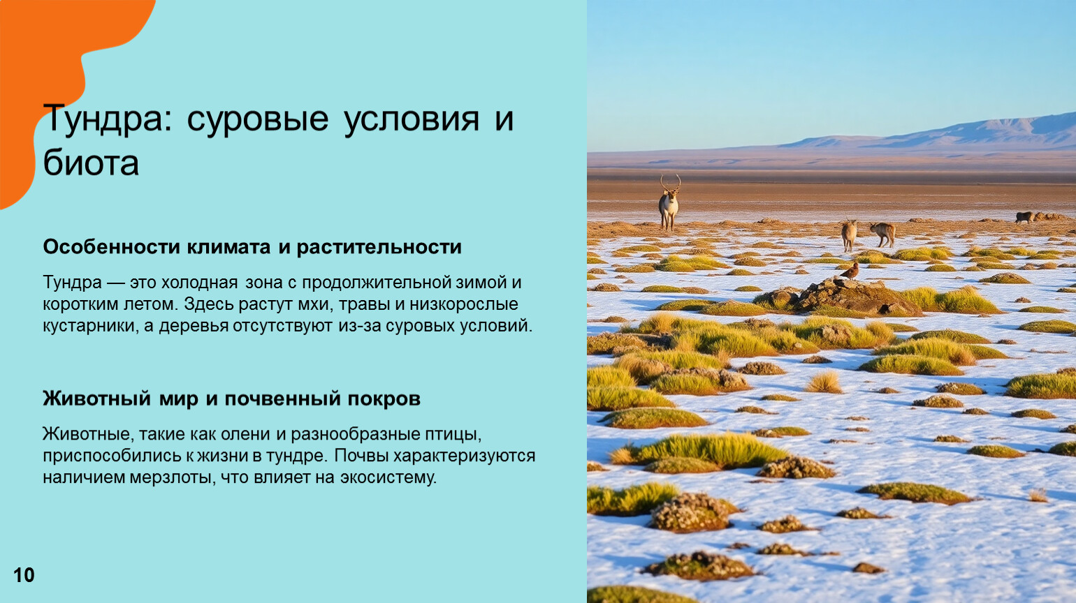 Тундра: суровые условия и биота Особенности климата и растительности Тундра — это холодная зона с продолжительной зимой и коротким летом. Здесь растут мхи, травы и низкорослые кустарники, а деревья отсутствуют из-за суровых условий. Животный мир и почвенный покров Животные, такие как олени и разнообразные птицы, приспособились к жизни в тундре. Почвы характеризуются наличием мерзлоты, что влияет на экосистему.