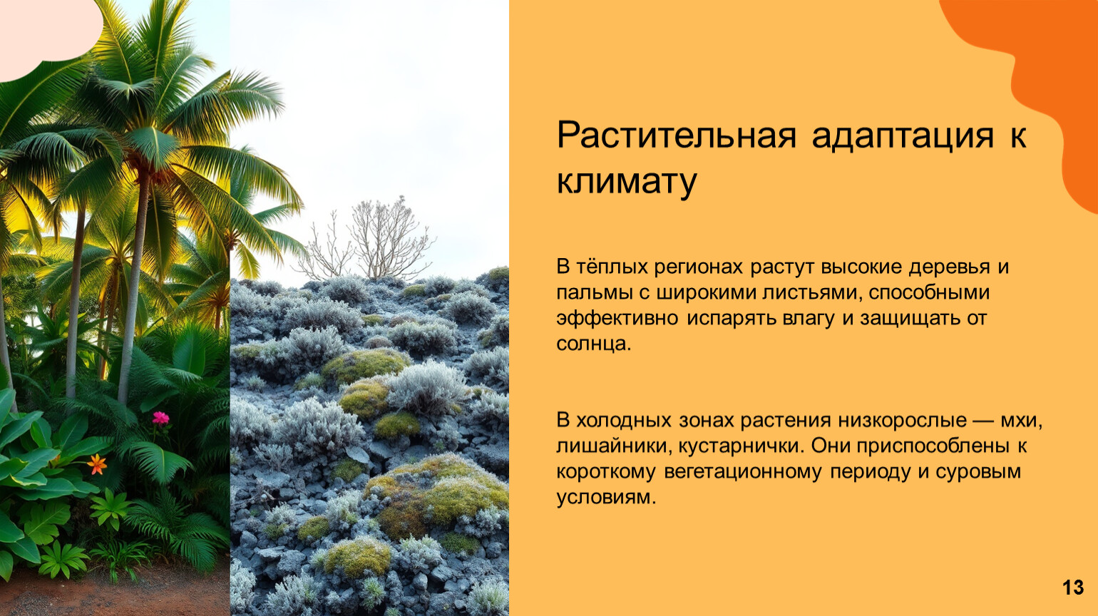 Растительная адаптация к климату В тёплых регионах растут высокие деревья и пальмы с широкими листьями, способными эффективно испарять влагу и защищать от солнца. В холодных зонах растения низкорослые — мхи, лишайники, кустарнички. Они приспособлены к короткому вегетационному периоду и суровым условиям.
