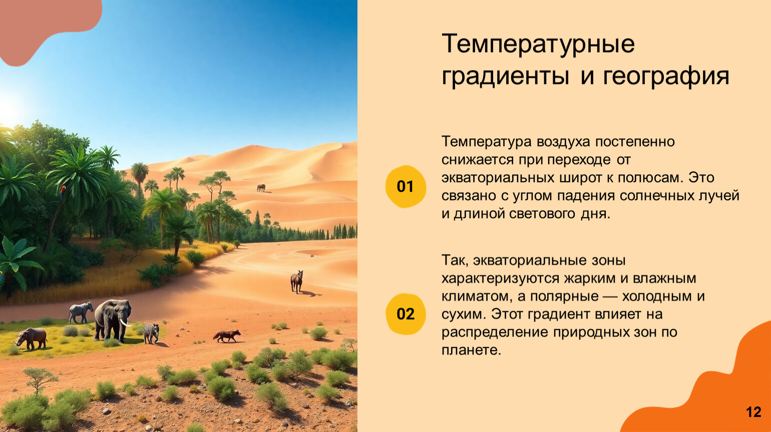 Так, экваториальные зоны характеризуются жарким и влажным климатом, а полярные — холодным и сухим. Этот градиент влияет на распределение природных зон по планете.