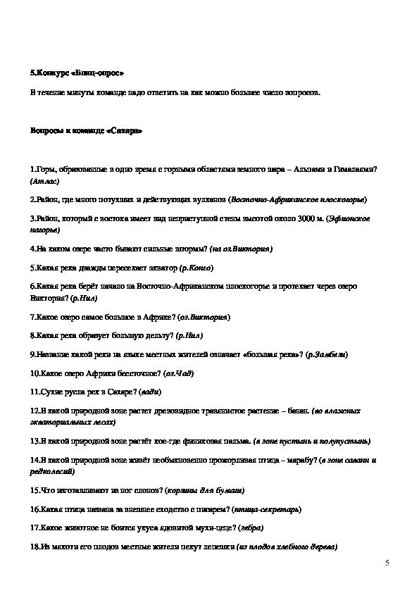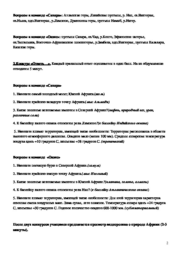 правильный ответ оценивается в один балл.Вопросы к команде «Сахара»: Атласские горы, Ливийская пустыня, р. Нил, оз.Виктория,