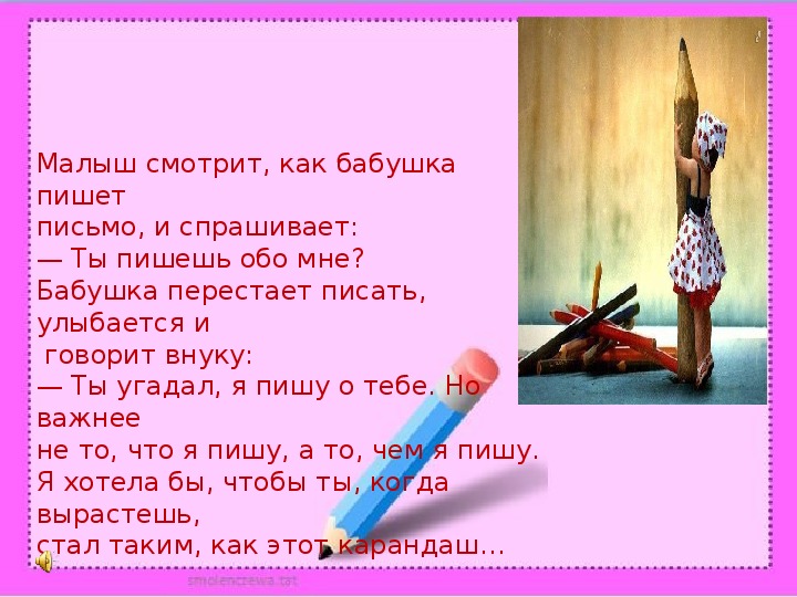 Презентация выполнена на 9 слайдах, сопровождается красивой инструментальной мелодией.Притча о карандаше