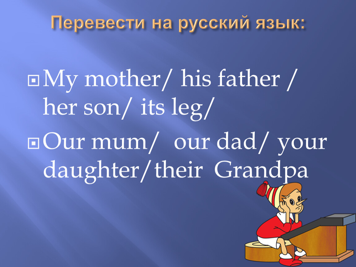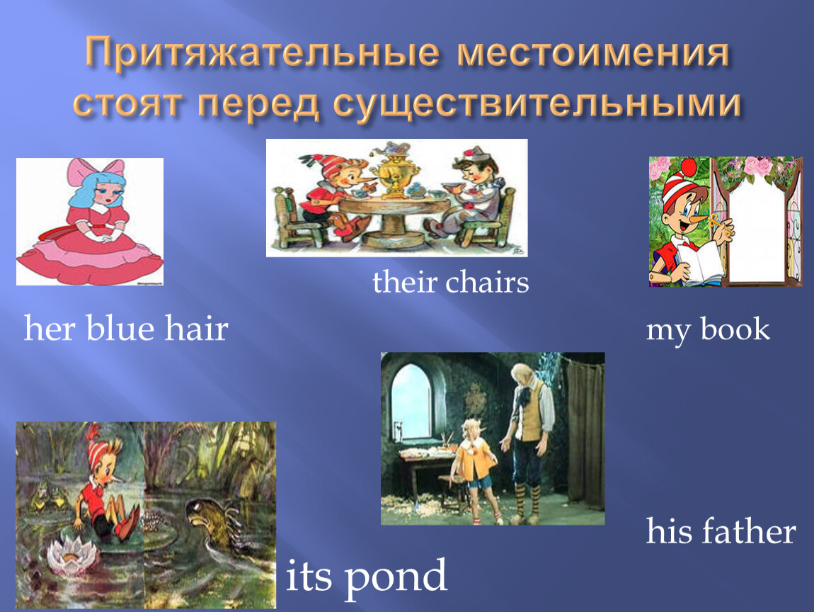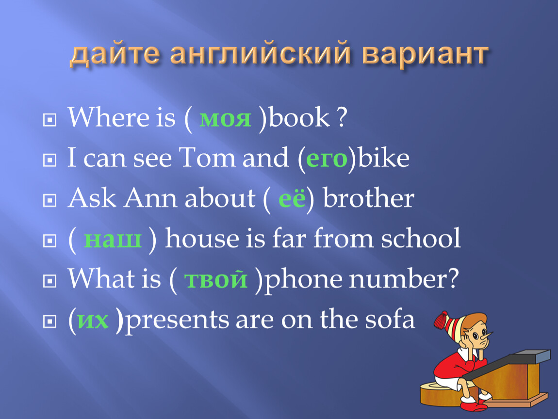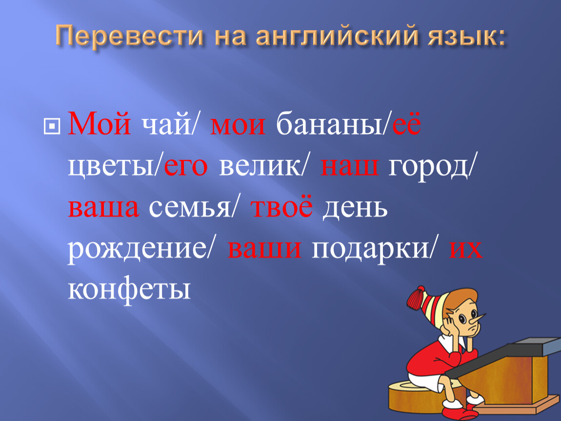 Мой чай/ мои бананы/её цветы/его велик/ наш город/ ваша семья/ твоё день рождение/ ваши подарки/ их конфеты
