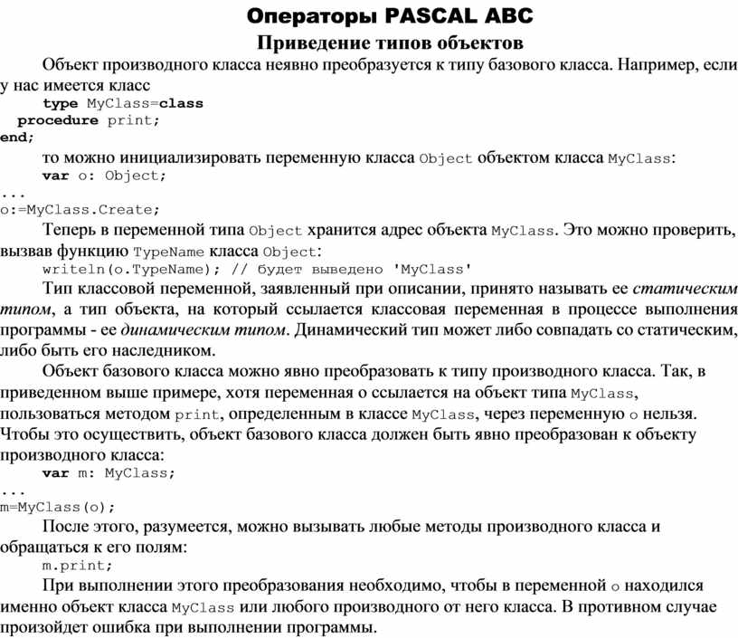 Объект базового класса можно явно преобразовать к типу производного класса. Так, в приведенном выше примере, хотя переменная o ссылается на объект типа MyClass, пользоваться методом print, определенным в классе MyClass, через переменную o нельзя. Чтобы это осуществить, объект базового класса должен быть явно преобразован к объекту производного класса: