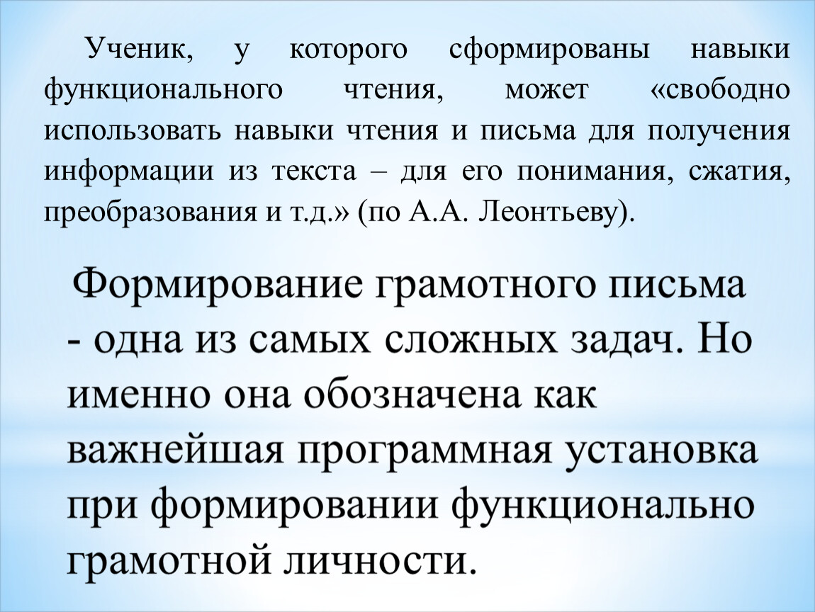 Ученик, у которого сформированы навыки функционального чтения, может «свободно использовать навыки чтения и письма для получения информации из текста – для его понимания, сжатия, преобразования и т.д.» (по А.А. Леонтьеву).