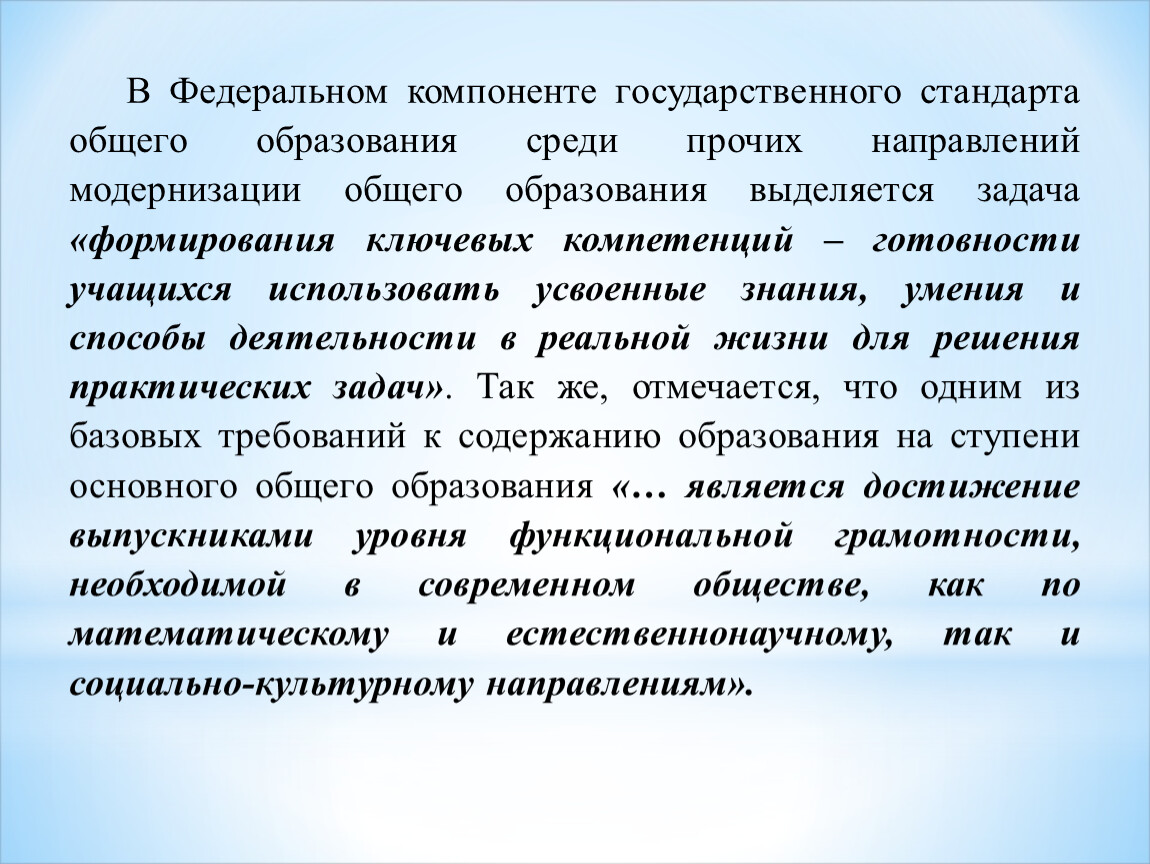 В Федеральном компоненте государственного стандарта общего образования среди прочих направлений модернизации общего образования выделяется задача «формирования ключевых компетенций – готовности учащихся использовать усвоенные знания, умения и способы деятельности в реальной жизни для решения практических задач». Так же, отмечается, что одним из базовых требований к содержанию образования на ступени основного общего образования «… является достижение выпускниками уровня функциональной грамотности, необходимой в современном обществе, как по математическому и естественнонаучному, так и социально-культурному направлениям».