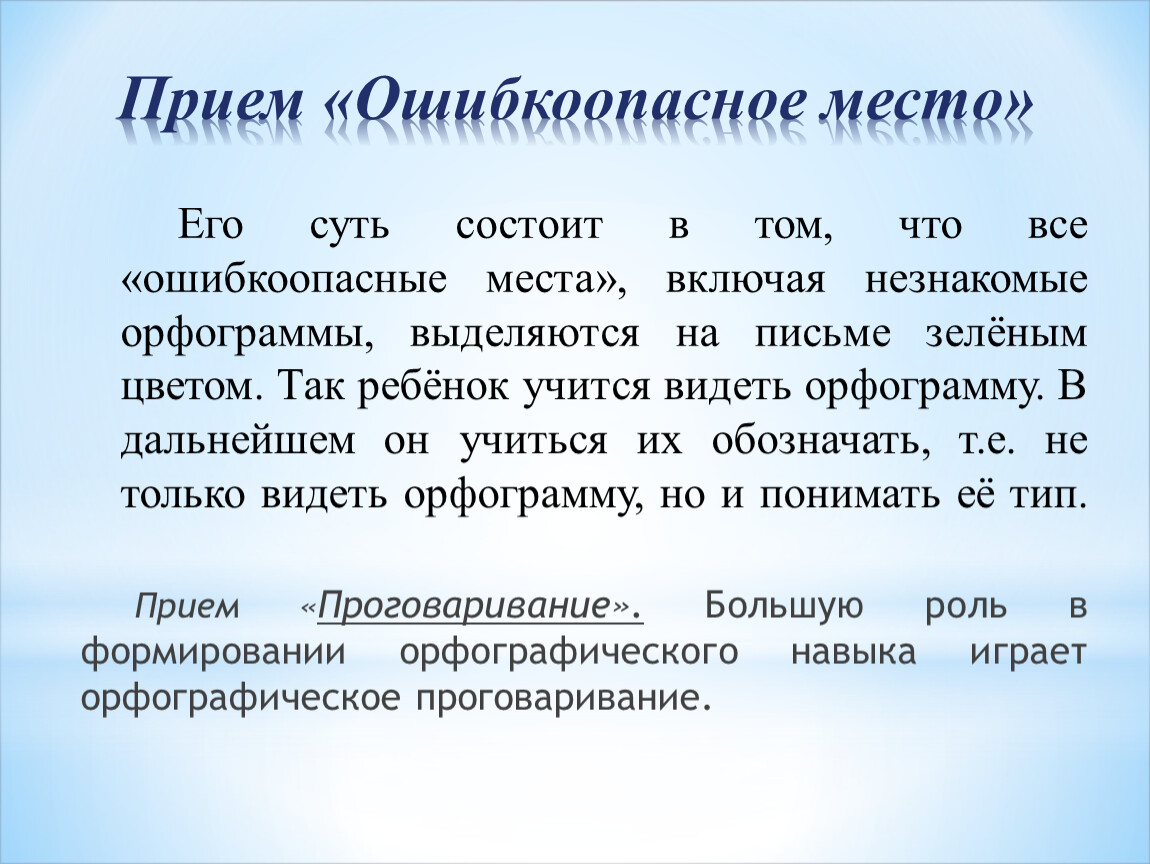 Его суть состоит в том, что все «ошибкоопасные места», включая незнакомые орфограммы, выделяются на письме зелёным цветом. Так ребёнок учится видеть орфограмму. В дальнейшем он учиться их обозначать, т.е. не только видеть орфограмму, но и понимать её тип.