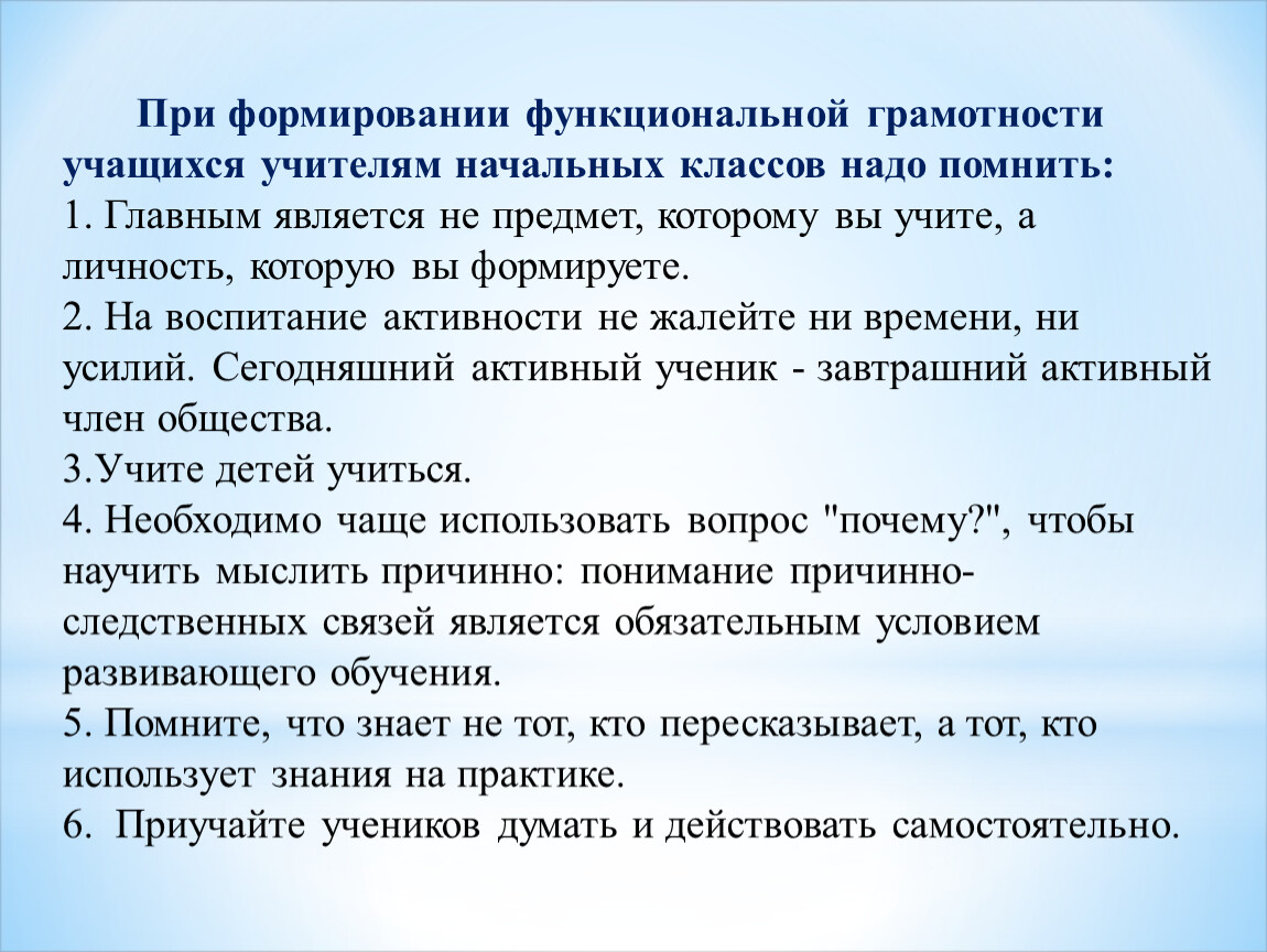 При формировании функциональной грамотности учащихся учителям начальных классов надо помнить: