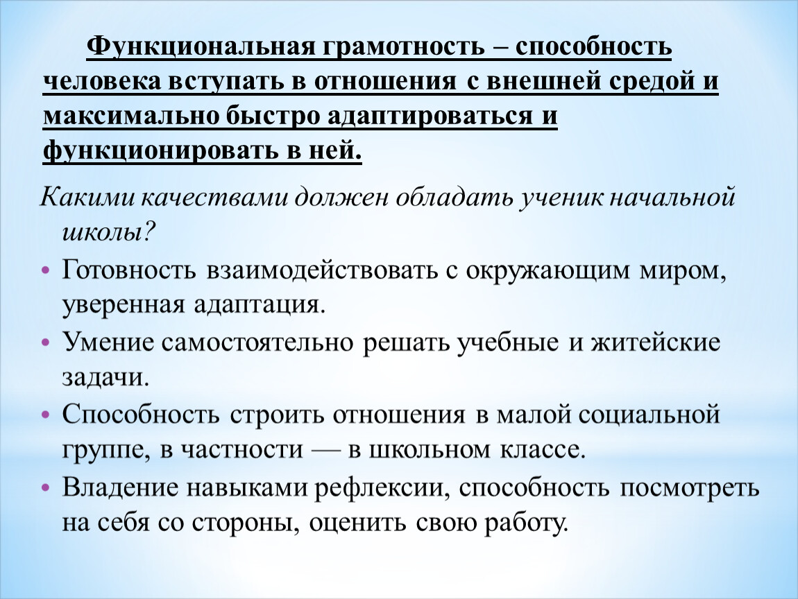 Функциональная грамотность – способность человека вступать в отношения с внешней средой и максимально быстро адаптироваться и функционировать в ней.
