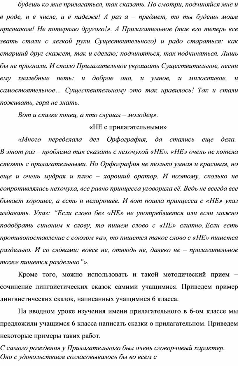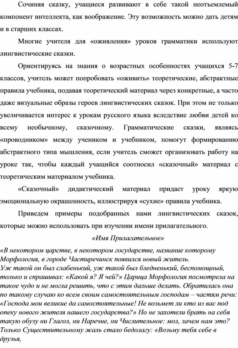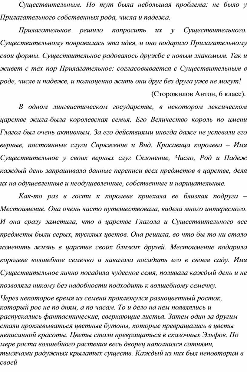Кроме того, можно использовать и такой методический прием – сочинение лингвистических сказок самими учащимися. Приведем пример лингвистических сказок, написанных учащимися 6 класса.