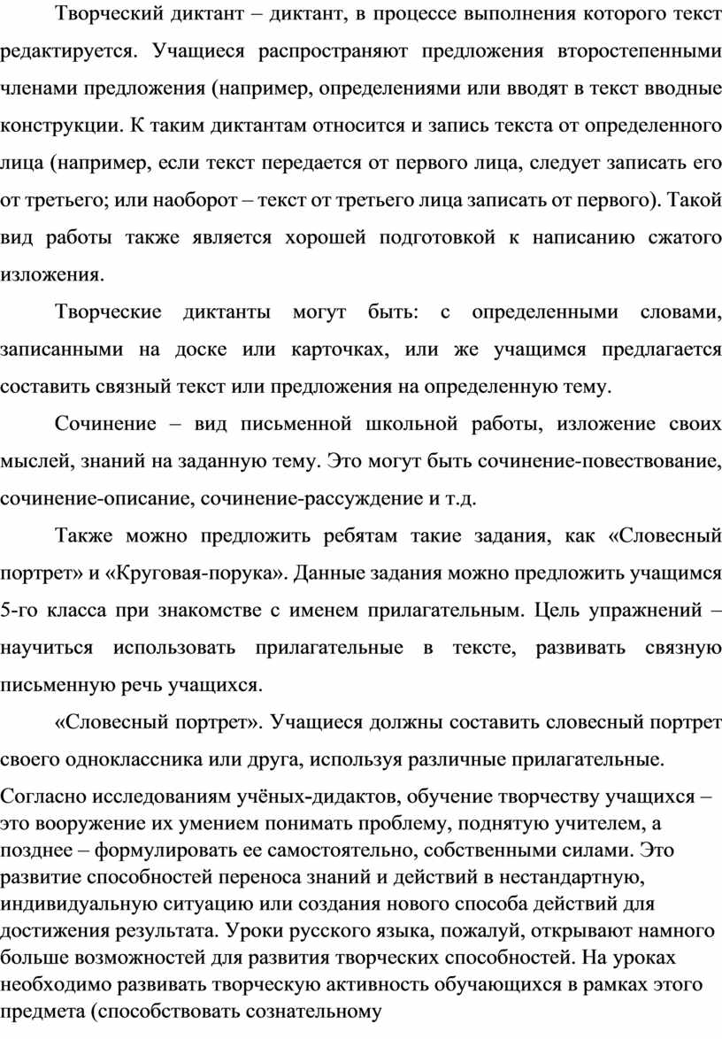 Согласно исследованиям учёных-дидактов, обучение творчеству учащихся – это вооружение их умением понимать проблему, поднятую учителем, а позднее – формулировать ее самостоятельно, собственными силами. Это развитие способностей переноса знаний и действий в нестандартную, индивидуальную ситуацию или создания нового способа действий для достижения результата. Уроки русского языка, пожалуй, открывают намного больше возможностей для развития творческих способностей. На уроках необходимо развивать творческую активность обучающихся в рамках этого предмета (способствовать сознательному овладению богатством родного языка и развитию речи), а также стимулировать развитие личности ученика и стойкое стремление к творчеству.