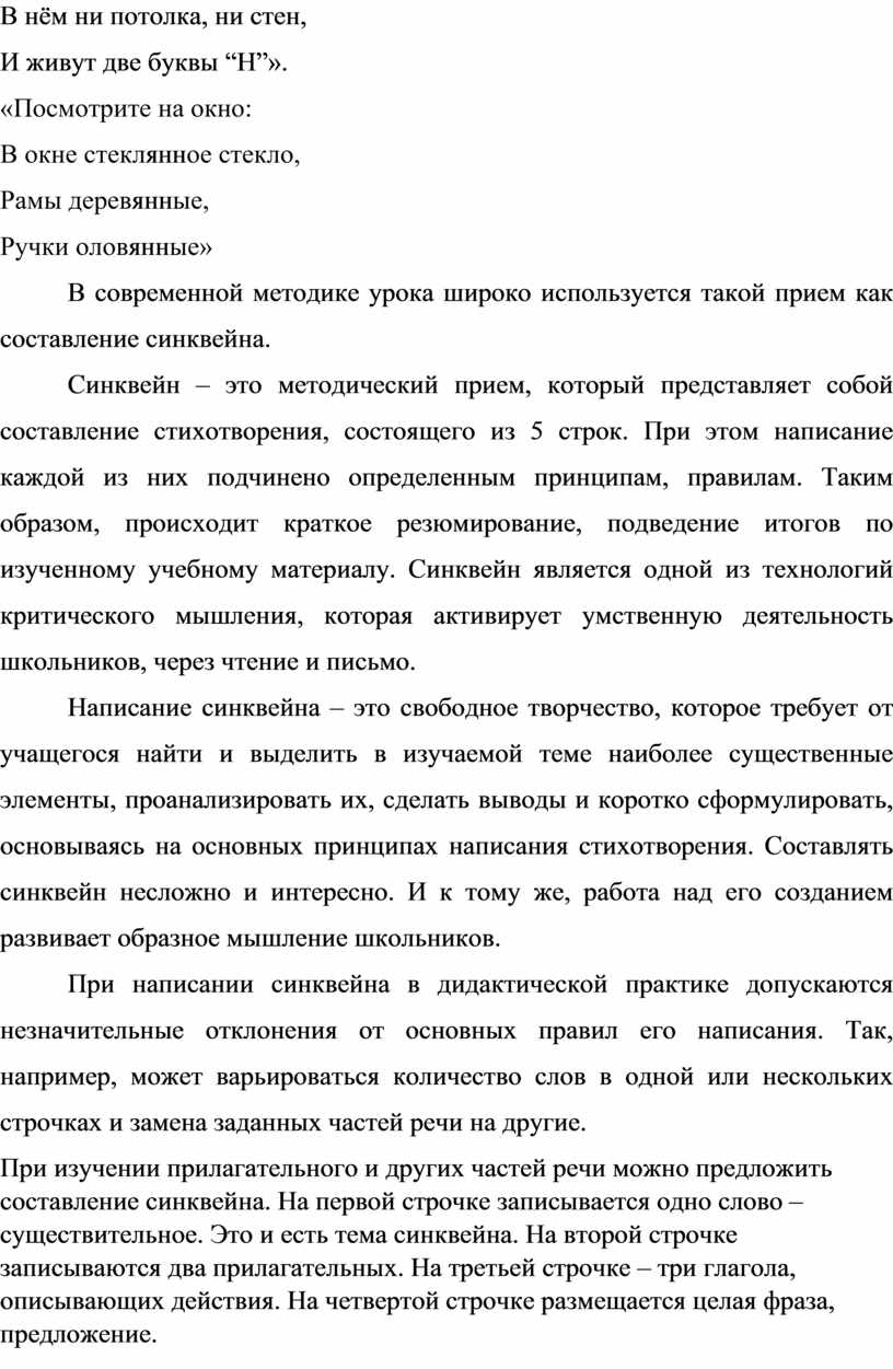 При изучении прилагательного и других частей речи можно предложить составление синквейна. На первой строчке записывается одно слово –существительное. Это и есть тема синквейна. На второй строчке записываются два прилагательных. На третьей строчке – три глагола, описывающих действия. На четвертой строчке размещается целая фраза, предложение. Последняя строчка – это слово-резюме, которое дает новую интерпретацию темы, позволяет выразить к ней личное отношение.