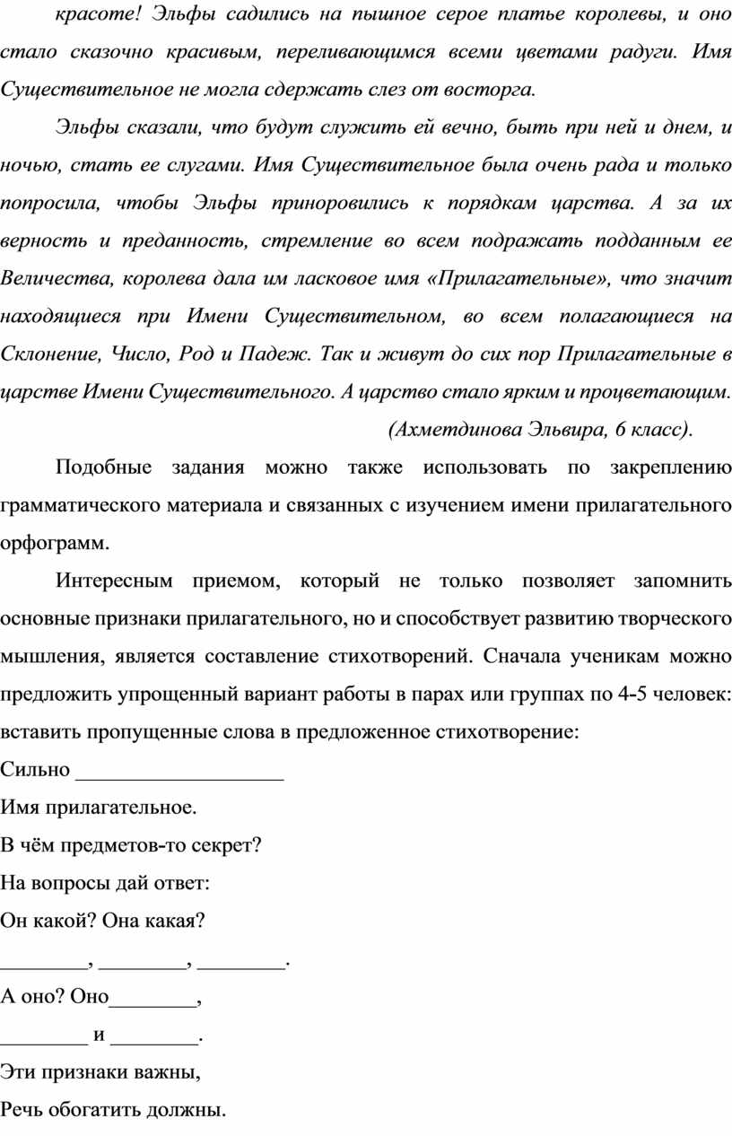 Эльфы сказали, что будут служить ей вечно, быть при ней и днем, и ночью, стать ее слугами. Имя Существительное была очень рада и только попросила, чтобы Эльфы приноровились к порядкам царства. А за их верность и преданность, стремление во всем подражать подданным ее Величества, королева дала им ласковое имя «Прилагательные», что значит находящиеся при Имени Существительном, во всем полагающиеся на Склонение, Число, Род и Падеж. Так и живут до сих пор Прилагательные в царстве Имени Существительного. А царство стало ярким и процветающим.