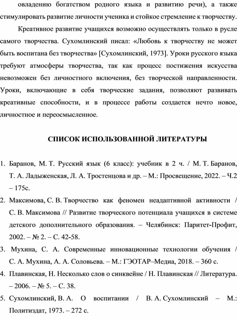 Креативное развитие учащихся возможно осуществлять только в русле самого творчества. Сухомлинский писал: «Любовь к творчеству не может быть воспитана без творчества» [Сухомлинский, 1973]. Уроки русского языка требуют атмосферы творчества, так как процесс постижения искусства невозможен без личностного включения, без творческой направленности. Уроки, включающие в себя творческие задания, позволяют развивать креативные способности, и в процессе работы создается нечто новое, личностное и переосмысленное.