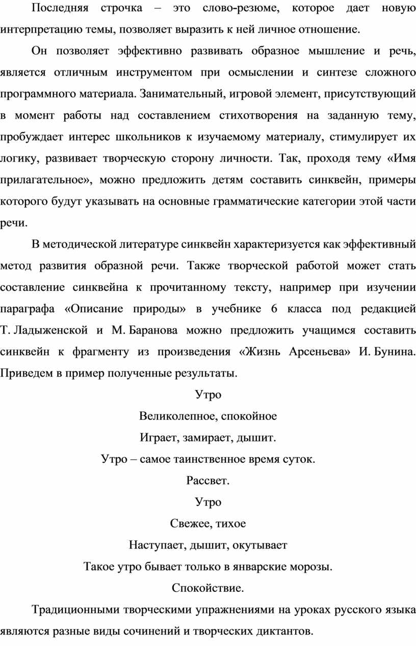 В методической литературе синквейн характеризуется как эффективный метод развития образной речи. Также творческой работой может стать составление синквейна к прочитанному тексту, например при изучении параграфа «Описание природы» в учебнике 6 класса под редакцией Т. Ладыженской и М. Баранова можно предложить учащимся составить синквейн к фрагменту из произведения «Жизнь Арсеньева» И. Бунина. Приведем в пример полученные результаты.