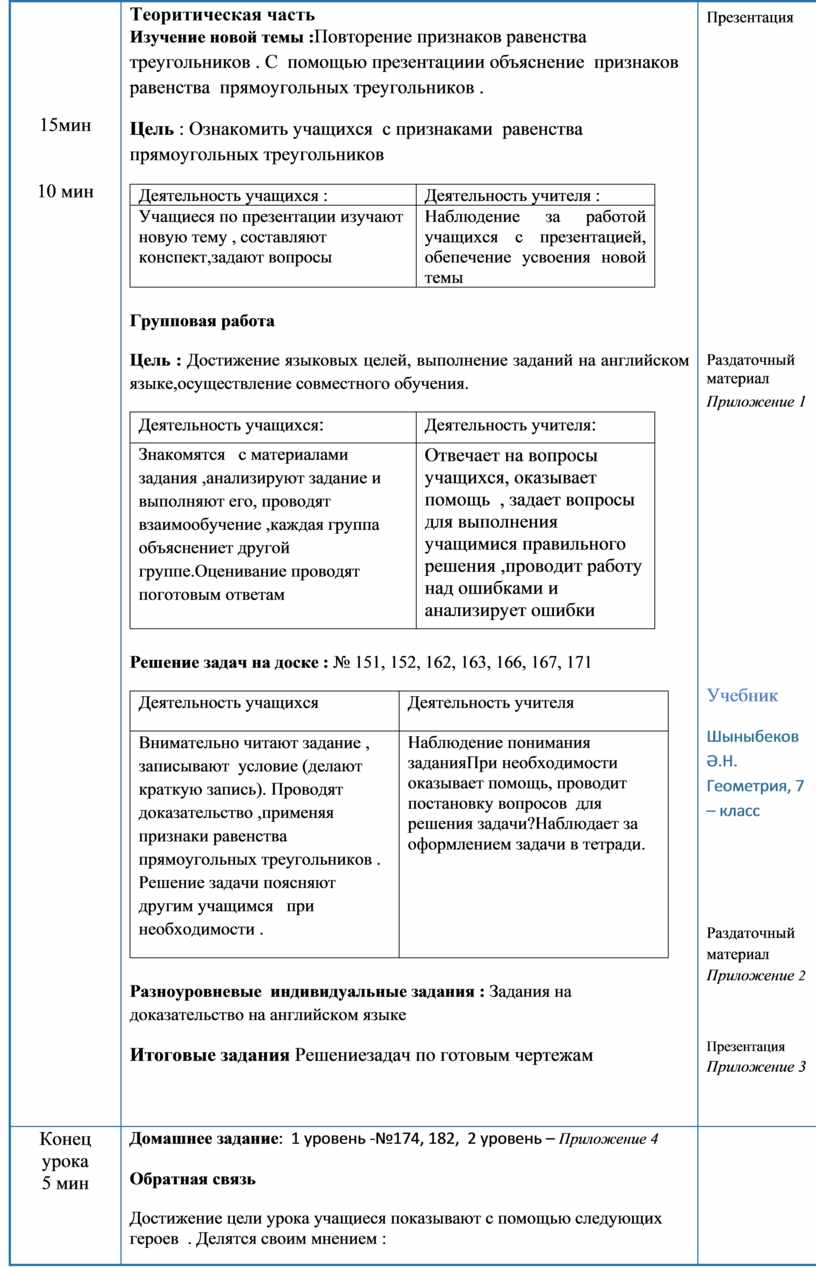 7.3.1.25 доказывать признаки равенства прямоугольных треугольников на основе признаков равенства треугольников; 7.3.1.26 применять признаки равенства прямоугольных треугольников при решении задач |