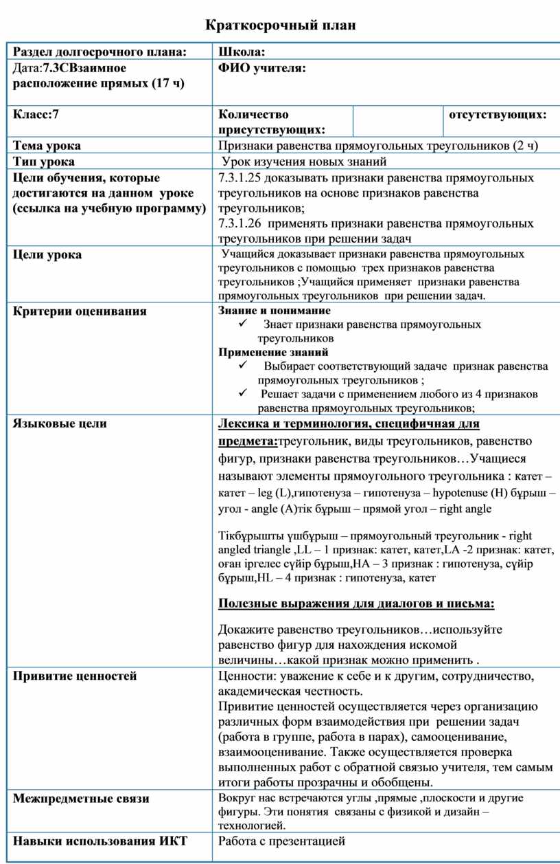 Лексика и терминология, специфичная для предмета:треугольник, виды треугольников, равенство фигур, признаки равенства треугольников…Учащиеся называют элементы прямоугольного треугольника : катет – катет – leg (L),гипотенуза – гипотенуза – hypotenuse (H) бұрыш – угол - аngle (A)тік бұрыш – прямой угол – right angle Тікбұрышты үшбұрыш – прямоугольный треугольник - right angled triangle ,LL – 1 признак: катет, катет,LA -2 признак: катет, оған іргелес сүйір бұрыш,HA – 3 признак : гипотенуза, сүйір бұрыш,HL – 4 признак : гипотенуза, катет Полезные выражения для диалогов и письма: Докажите равенство треугольников…используйте равенство фигур для нахождения искомой величины…какой признак можно применить . |
