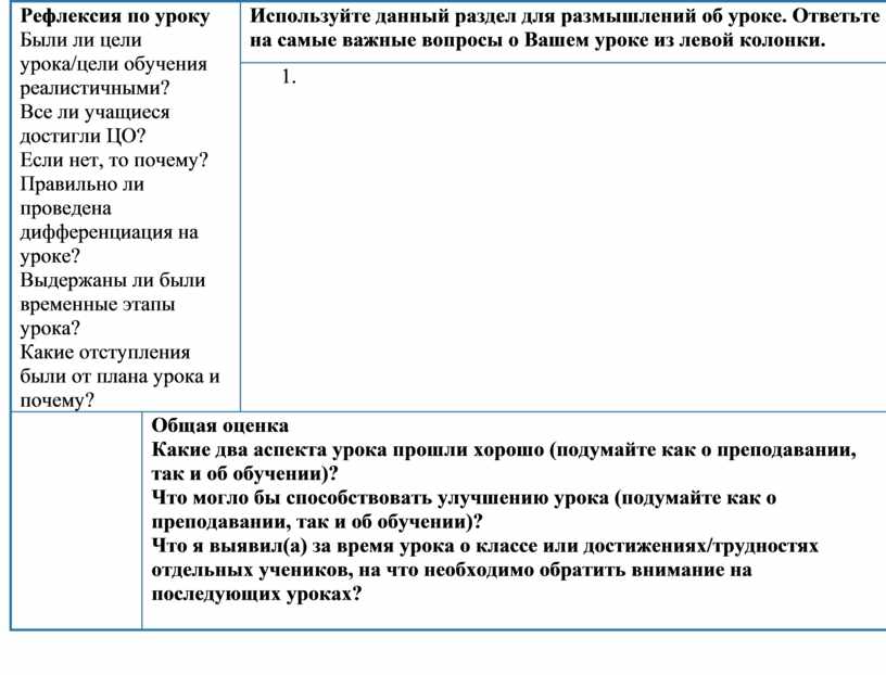 Используйте данный раздел для размышлений об уроке. Ответьте на самые важные вопросы о Вашем уроке из левой колонки. |