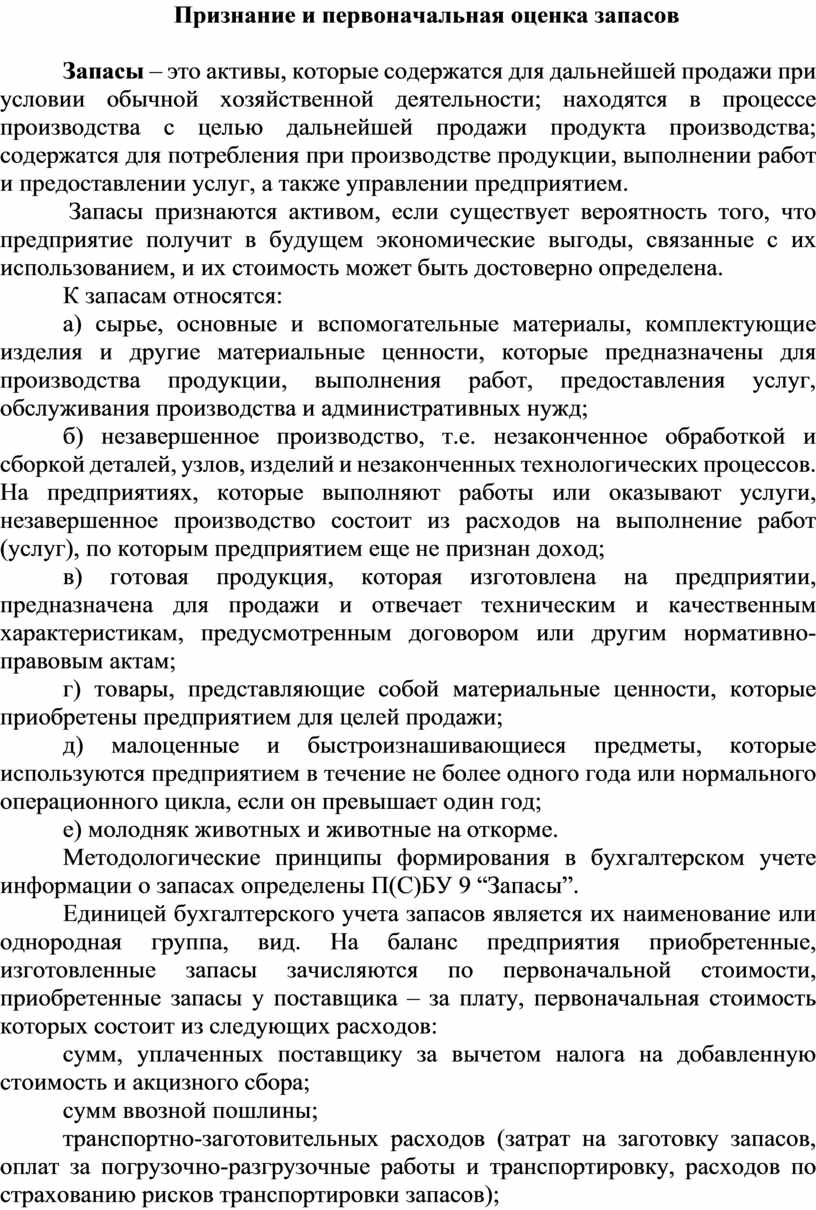 Запасы – это активы, которые содержатся для дальнейшей продажи при условии обычной хозяйственной деятельности; находятся в процессе производства с целью дальнейшей продажи продукта производства; содержатся для потребления при производстве продукции, выполнении работ и предоставлении услуг, а также управлении предприятием.