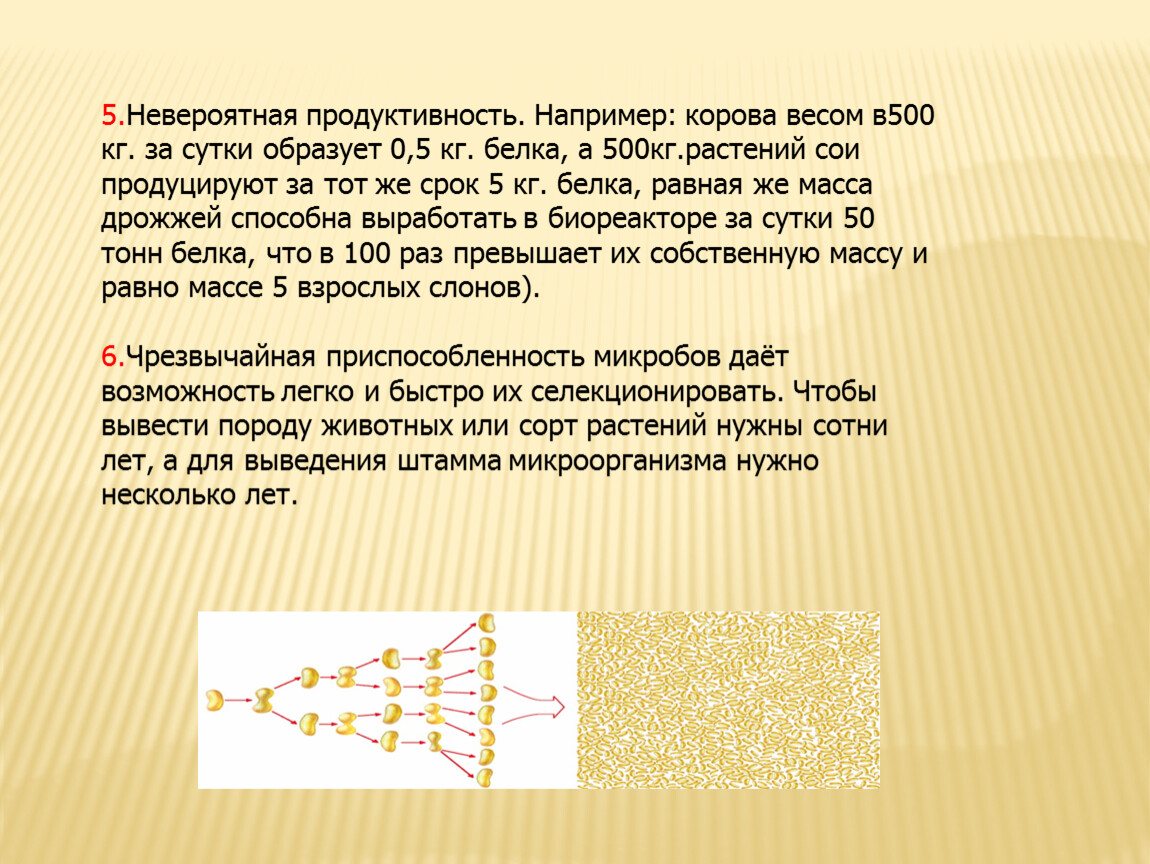 5.Невероятная продуктивность. Например: корова весом в500 кг. за сутки образует 0,5 кг. белка, а 500кг.растений сои продуцируют за тот же срок 5 кг. белка, равная же масса дрожжей способна выработать в биореакторе за сутки 50 тонн белка, что в 100 раз превышает их собственную массу и равно массе 5 взрослых слонов).