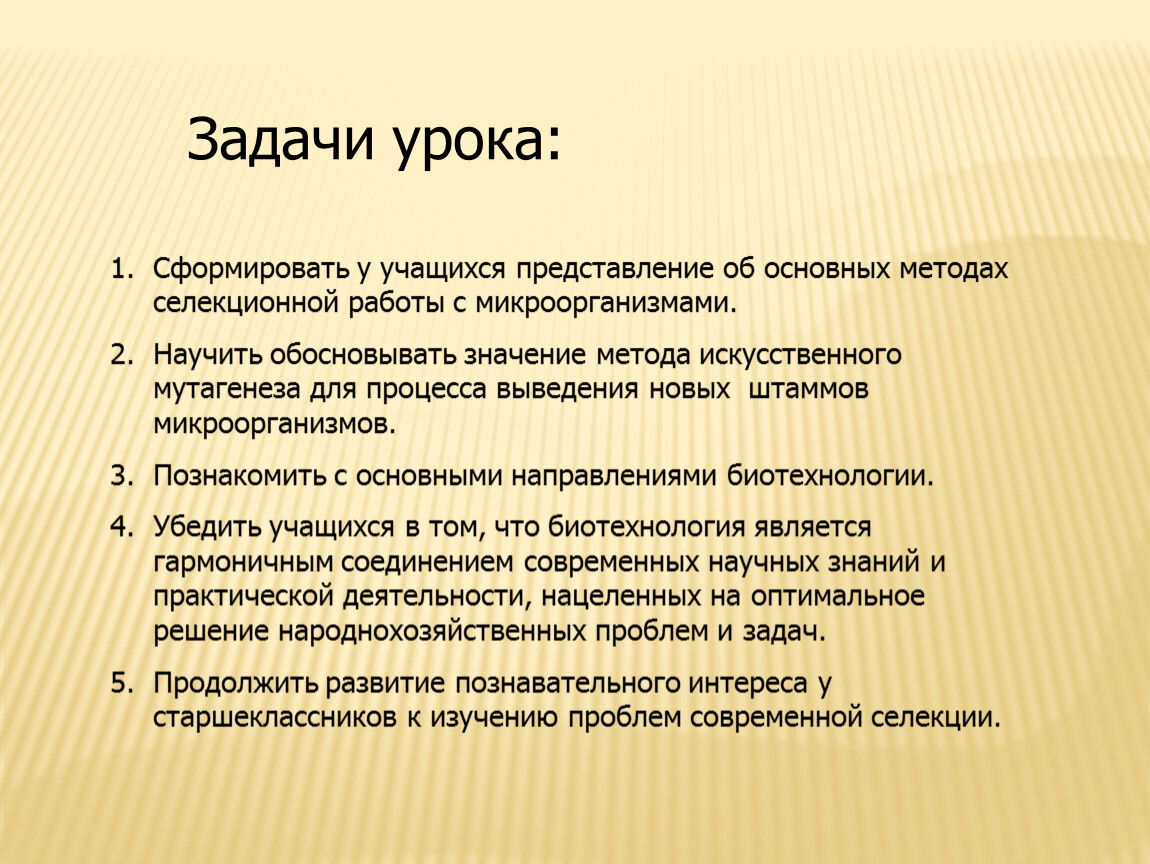Убедить учащихся в том, что биотехнология является гармоничным соединением современных научных знаний и практической деятельности, нацеленных на оптимальное решение народнохозяйственных проблем и задач.