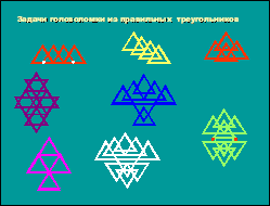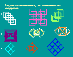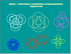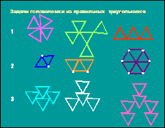 После изучения уникурсальных графов мы разработали сборник задачи – головоломки (ПРИЛОЖЕНИЕ 2). Первый вариант головоломок составили из окружностей, где проследили следующую закономерность: головоломки, составленные из пересекающихся окружностей - всегда являются уникурсальными графами, следовательно, решаемы. Второй вариант головоломок составляли из равносторонних треугольников, при этом рассматривали четыре варианта их соединения и получил такие результаты: при соединении вершинами получаются уникурсальные графы, значит, задачи решаемы; при соединении сторонами и вершинами – решаемые и не решаемые головоломки; уникурсальными получаются графы, полученные и путем присоединения вершины к стороне (имеют одну общую точку) головоломки, составленные из пересекающихся правильных треугольников, также являются уникурсальными графами. Третий вид головоломок – из квадратов. При тех же вариантах соединения прослеживаются такие же закономерности