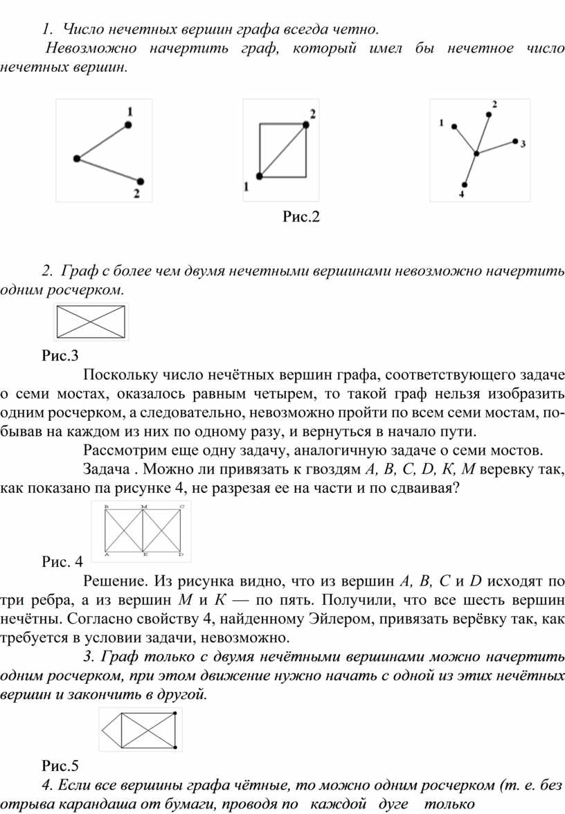 2. Граф с более чем двумя нечетными вершинами невозможно начертить одним росчерком.