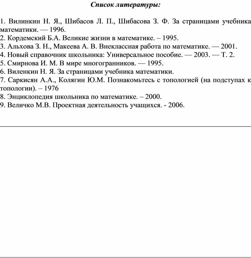 1. Вилинкин Н. Я., Шибасов Л. П., Шибасова З. Ф. За страницами учебника математики. — 1996.