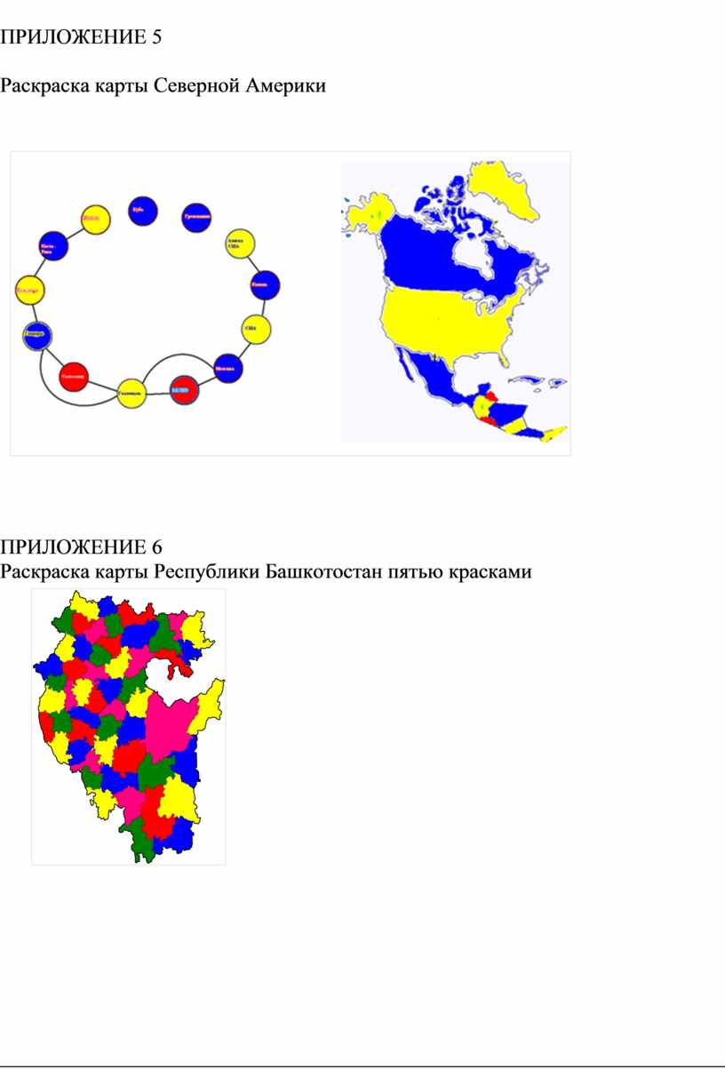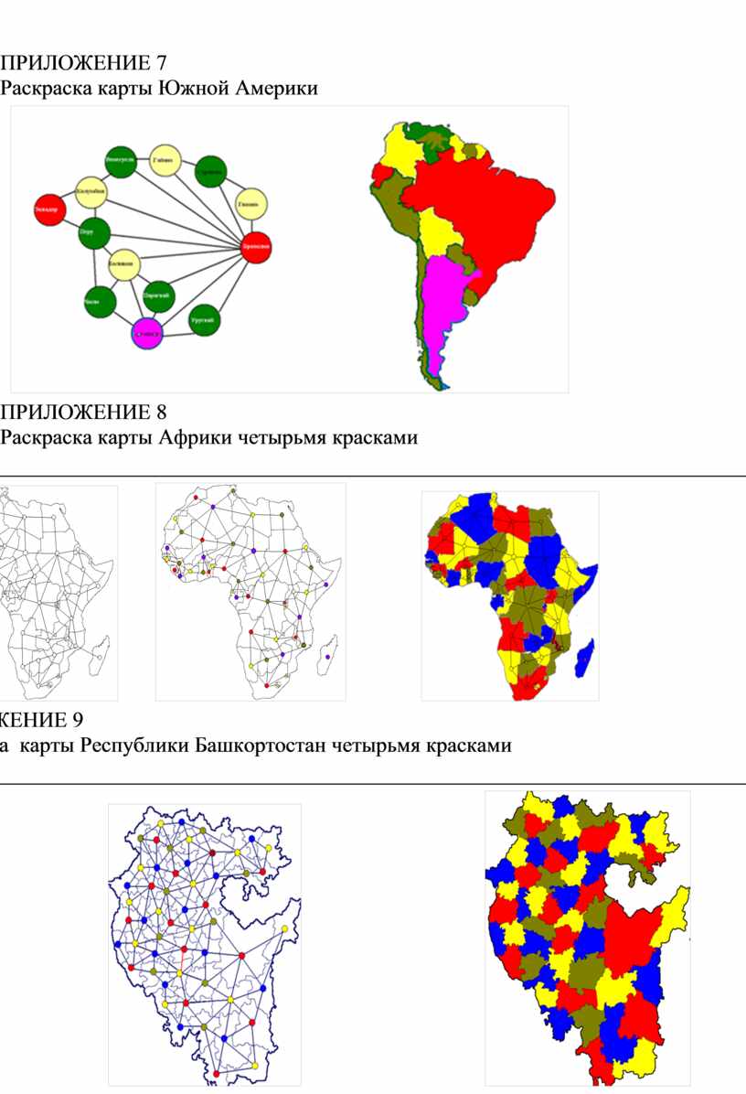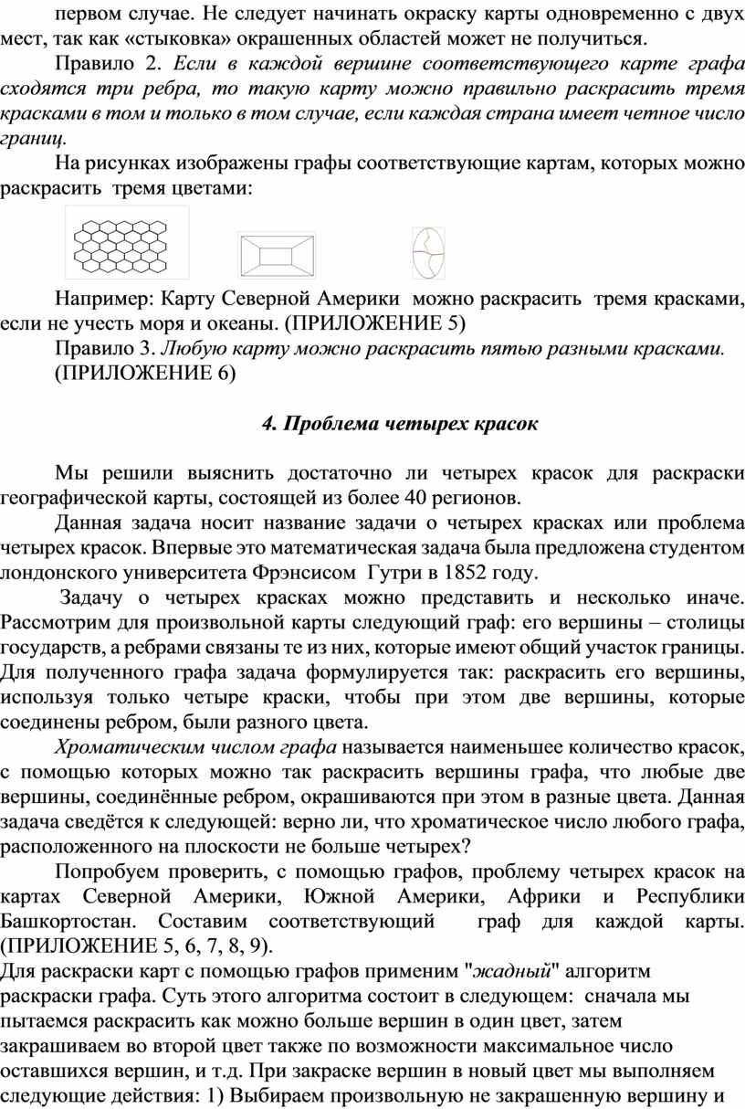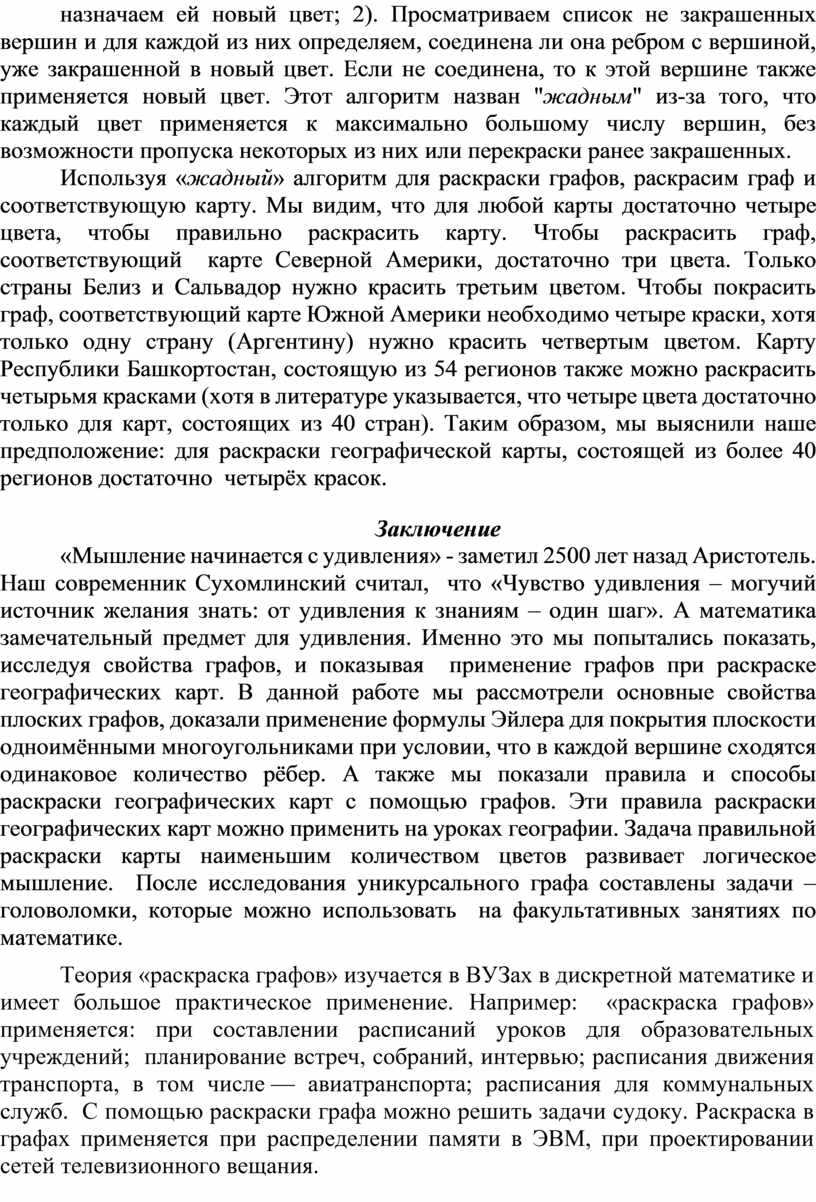 Используя «жадный» алгоритм для раскраски графов, раскрасим граф и соответствующую карту. Мы видим, что для любой карты достаточно четыре цвета, чтобы правильно раскрасить карту. Чтобы раскрасить граф, соответствующий карте Северной Америки, достаточно три цвета. Только страны Белиз и Сальвадор нужно красить третьим цветом. Чтобы покрасить граф, соответствующий карте Южной Америки необходимо четыре краски, хотя только одну страну (Аргентину) нужно красить четвертым цветом. Карту Республики Башкортостан, состоящую из 54 регионов также можно раскрасить четырьмя красками (хотя в литературе указывается, что четыре цвета достаточно только для карт, состоящих из 40 стран). Таким образом, мы выяснили наше предположение: для раскраски географической карты, состоящей из более 40 регионов достаточно четырёх красок.