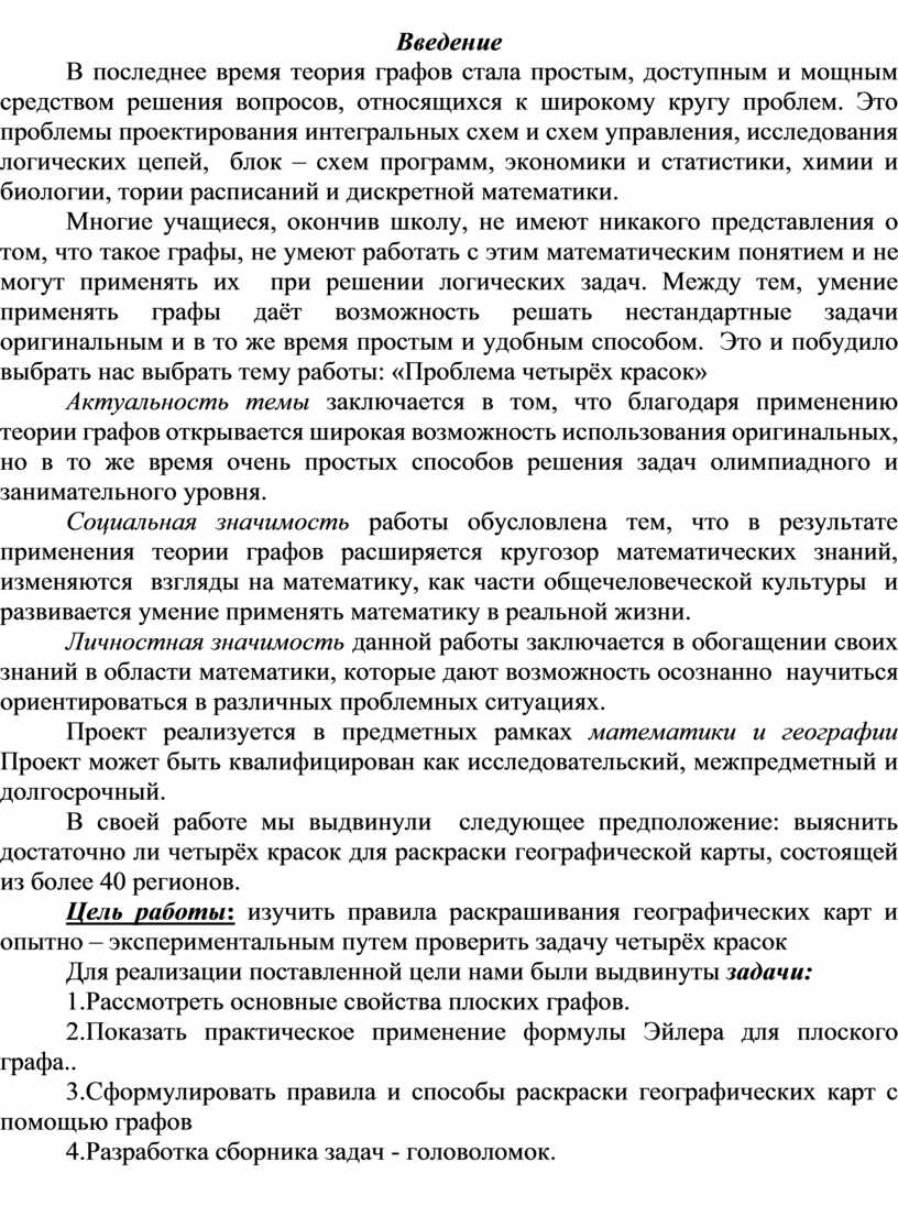 Многие учащиеся, окончив школу, не имеют никакого представления о том, что такое графы, не умеют работать с этим математическим понятием и не могут применять их при решении логических задач. Между тем, умение применять графы даёт возможность решать нестандартные задачи оригинальным и в то же время простым и удобным способом. Это и побудило выбрать нас выбрать тему работы: «Проблема четырёх красок»
