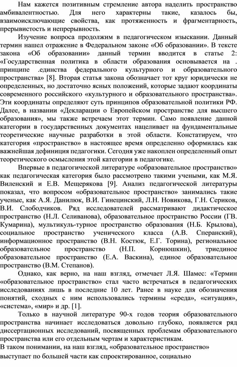 Изучение вопроса продолжим в педагогическом изыскании. Данный термин нашел отражение в Федеральном законе «Об образовании». В тексте закона «Об образовании» данный термин вводится в статье 2: «Государственная политика в области образования основывается на . принципе .единства федерального культурного и образовательного пространства» [8]. Вторая статья закона обозначает тот круг юридически не определенных, но достаточно ясных положений, которые задают координаты современного российского «культурного и образовательного пространства». Эти координаты определяют суть принципов образовательной политики РФ. Далее, в названии «Декларации о Европейском пространстве для высшего образования», мы также встречаем этот термин. Само появление данной категории в государственных документах нацеливает на фундаментальные теоретические научные разработки в этой области. Констатируем, что категория «пространство» в настоящее время определенно оформилась как важнейшая дефиниция педагогики. Сегодня уже накоплен определенный опыт теоретического осмысления этой категории в педагогике.