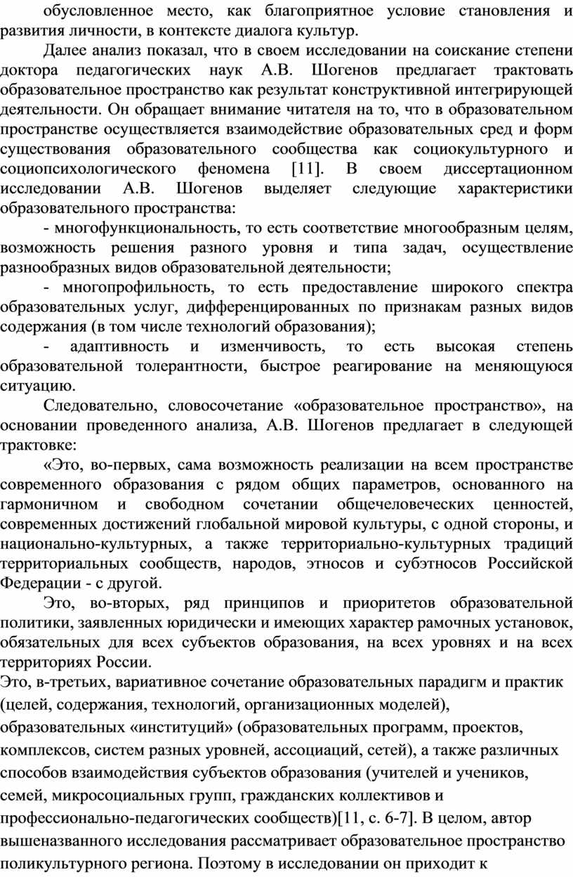 Далее анализ показал, что в своем исследовании на соискание степени доктора педагогических наук А.В. Шогенов предлагает трактовать образовательное пространство как результат конструктивной интегрирующей деятельности. Он обращает внимание читателя на то, что в образовательном пространстве осуществляется взаимодействие образовательных сред и форм существования образовательного сообщества как социокультурного и социопсихологического феномена [11]. В своем диссертационном исследовании А.В. Шогенов выделяет следующие характеристики образовательного пространства: