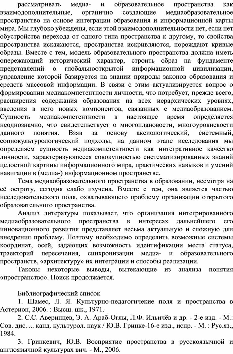 Аннотация. В статье проведен системный анализ по отношению к малоисследованным понятиям «пространство», «образовательное пространство», «информационное пространство», «виртуальное пространство» с целью сведения их в единую систему научной терминологии педагогики. В работе предпринят новый подход к рассмотрению медиа- и образовательного пространства как взаимодополнительных, на основе интеграции образования и информационной карты мира.