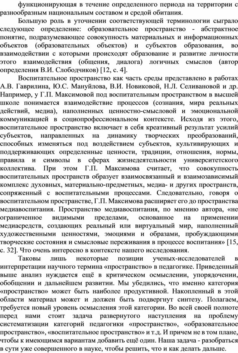 Воспитательное пространство как часть среды представлено в работах А.В. Гаврилина, Ю.С. Мануйлова, В.И. Новиковой, Н.Л. Селивановой и др. Например, у Г.П. Максимовой под воспитательным пространством в высшей школе понимается взаимодействие процессов (сознания, мира реальных действий, медиа), наполненных ценностно-смысловой и эмоциональной коммуникацией в социопрофессиональном контексте. Исходя из этого, воспитательное пространство включает в себя креативный результат усилий субъектов, направленных на динамику творческих преобразований, способных изменяться под воздействием субъектов, культивирующих и поддерживающих определенные ценности, традиции, отношения, нормы, правила и символы в сферах жизнедеятельности университетского коллектива. При этом Г.П. Максимова считает, что совокупность воспитательных пространств образует взаимосвязанный и взаимозависимый комплекс духовных, материально-предметных, медиа- и других пространств, сопряженный с воспитательными процессами. Следовательно, говоря о воспитательном пространстве, Г.П. Максимова расширяет его до пространства медиавоспитания. Пространство медиавоспитания, по мнению автора, «не ограниченное видимыми пределами, основанное на применении медиасредств, создающих реальный или виртуальный мир, наполненный художественными ценностями, эмоциями и образами, пробуждающими творческие состояния и смысловые переживания в процессе воспитания» [15, с. 32]. Что очень интересно в контексте нашего исследования.