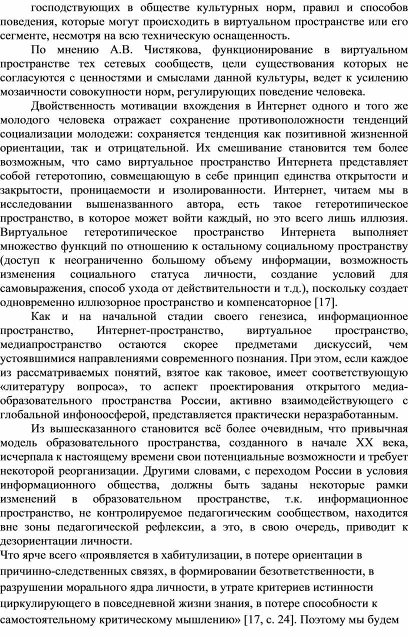 Утверждение А.В. Чистякова о том, что совмещение жизни индивида в реальном и виртуальном пространствах формирует третичную социализацию, актуализирует проблему объединения медиа- и образовательного пространств. Под третичной социализацией исследователь понимает интериоризацию норм, ценностей партнеров поведения, принятых в конкретном сетевом сообществе, членом которого стал данный индивид, или являющихся общепринятыми в социальной общности киберпространства в целом. Далее, в работе можно найти рассуждения, что третичная социализация в случае интериоризации ценностей и паттернов некоторых сетевых сообществ может перерождаться в «опрокинутую» социализацию, т.е. обеспечивать приобщение к нормам и ценностям, не отвечающим ни историческому прошлому, ни целям общества, ни накопленному культурному потенциалу. Это «опрокидывание назад», по мнению А.В. Чистякова, связано с архаизацией культуры, т.е. с общим процессом примитивизации общественных установлений, с разрушением господствующих в обществе культурных норм, правил и способов поведения, которые могут происходить в виртуальном пространстве или его сегменте, несмотря на всю техническую оснащенность.