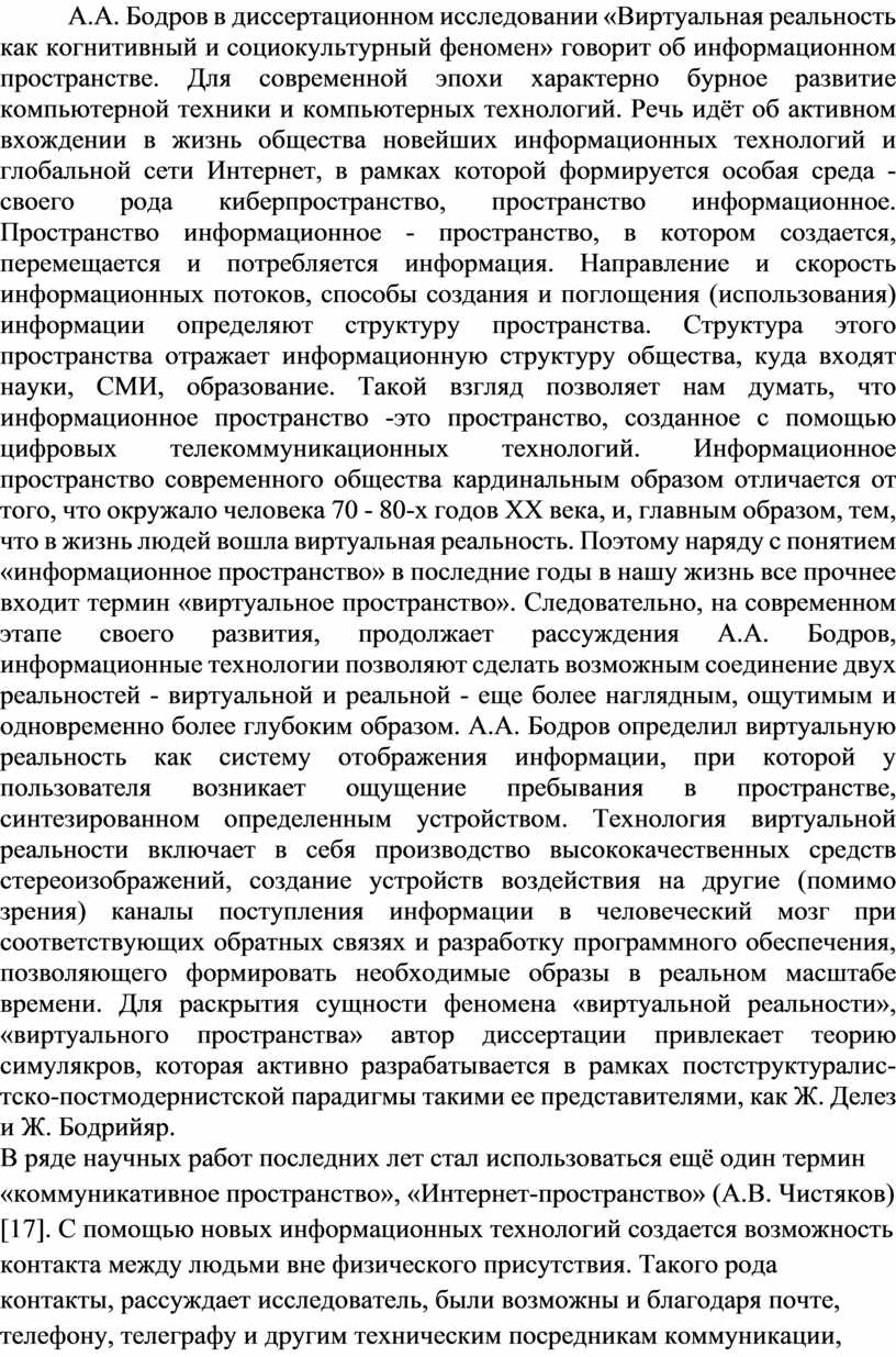 А.А. Бодров в диссертационном исследовании «Виртуальная реальность как когнитивный и социокультурный феномен» говорит об информационном пространстве. Для современной эпохи характерно бурное развитие компьютерной техники и компьютерных технологий. Речь идёт об активном вхождении в жизнь общества новейших информационных технологий и глобальной сети Интернет, в рамках которой формируется особая среда - своего рода киберпространство, пространство информационное. Пространство информационное - пространство, в котором создается, перемещается и потребляется информация. Направление и скорость информационных потоков, способы создания и поглощения (использования) информации определяют структуру пространства. Структура этого пространства отражает информационную структуру общества, куда входят науки, СМИ, образование. Такой взгляд позволяет нам думать, что информационное пространство -это пространство, созданное с помощью цифровых телекоммуникационных технологий. Информационное пространство современного общества кардинальным образом отличается от того, что окружало человека 70 - 80-х годов ХХ века, и, главным образом, тем, что в жизнь людей вошла виртуальная реальность. Поэтому наряду с понятием «информационное пространство» в последние годы в нашу жизнь все прочнее входит термин «виртуальное пространство». Следовательно, на современном этапе своего развития, продолжает рассуждения А.А. Бодров, информационные технологии позволяют сделать возможным соединение двух реальностей - виртуальной и реальной - еще более наглядным, ощутимым и одновременно более глубоким образом. А.А. Бодров определил виртуальную реальность как систему отображения информации, при которой у пользователя возникает ощущение пребывания в пространстве, синтезированном определенным устройством. Технология виртуальной реальности включает в себя производство высококачественных средств стереоизображений, создание устройств воздействия на другие (помимо зрения) каналы поступления информации в человеческий мозг при соответствующих обратных связях и разработку программного обеспечения, позволяющего формировать необходимые образы в реальном масштабе времени. Для раскрытия сущности феномена «виртуальной реальности», «виртуального пространства» автор диссертации привлекает теорию симулякров, которая активно разрабатывается в рамках постструктуралис-тско-постмодернистской парадигмы такими ее представителями, как Ж. Делез и Ж. Бодрийяр.