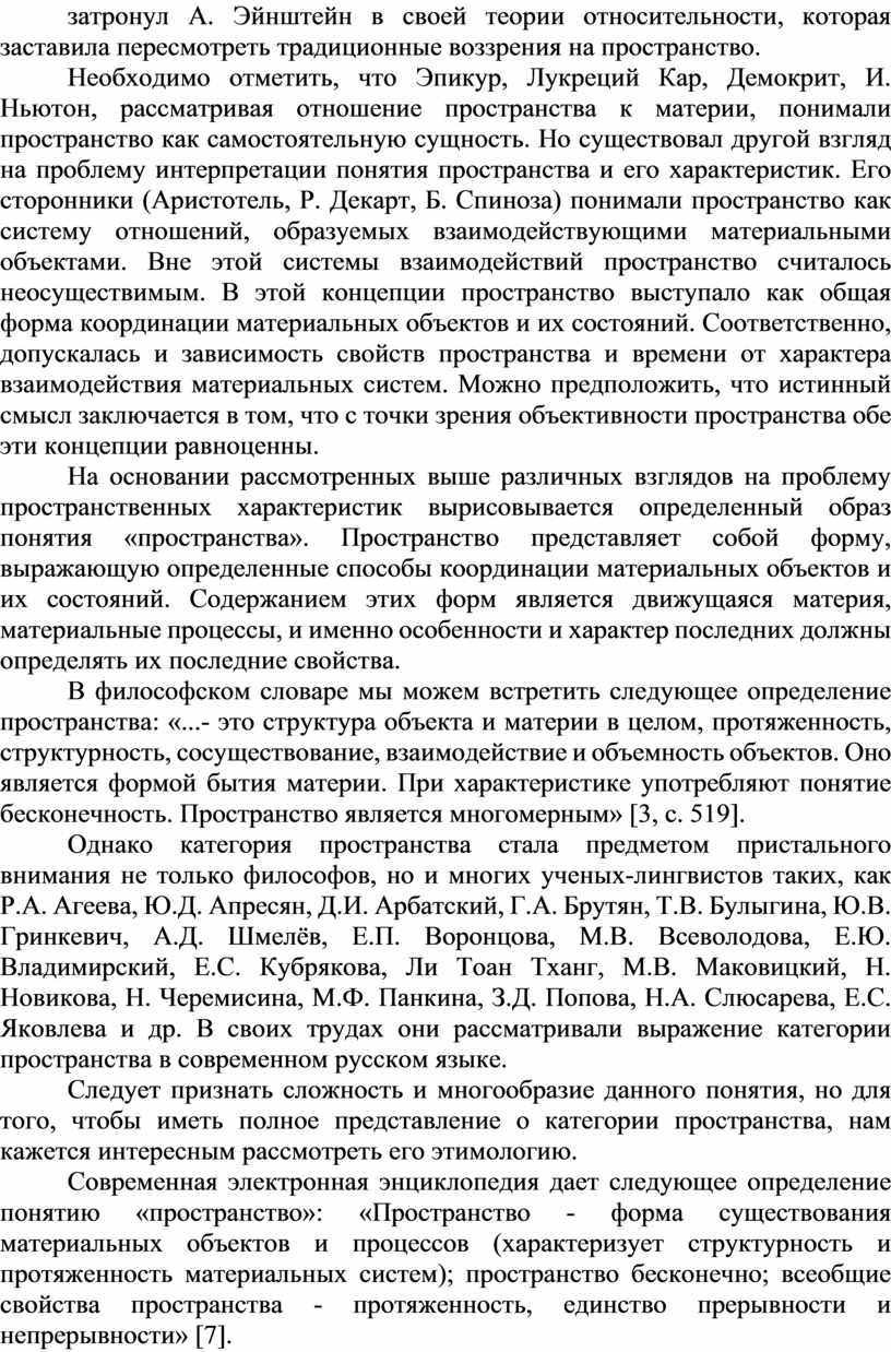 Однако категория пространства стала предметом пристального внимания не только философов, но и многих ученых-лингвистов таких, как Р.А. Агеева, Ю.Д. Апресян, Д.И. Арбатский, Г.А. Брутян, Т.В. Булыгина, Ю.В. Гринкевич, А.Д. Шмелёв, Е.П. Воронцова, М.В. Всеволодова, Е.Ю. Владимирский, Е.С. Кубрякова, Ли Тоан Тханг, М.В. Маковицкий, Н. Новикова, Н. Черемисина, М.Ф. Панкина, З.Д. Попова, Н.А. Слюсарева, Е.С. Яковлева и др. В своих трудах они рассматривали выражение категории пространства в современном русском языке.