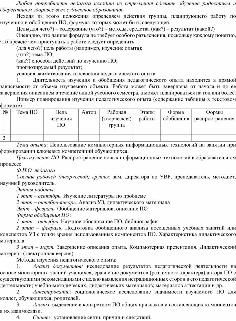 3. Длительность изучения и обобщения педагогического опыта находится в прямой зависимости от объема изучаемого объекта. Работа может быть завершена от начала и до ее завершения описанием в течение одной учебного семестра, а может планироваться на год или более.