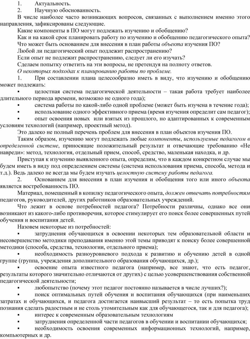 В то же время следует помнить, что изучение педагогического опыта по своему характеру есть научно-исследовательская деятельность, требующая непосредственного наблюдения живого педагогического процесса, научного осмысления изучаемого педагогического явления, анализа и сравнения результатов, подтверждения конкретными примерами педагогической деятельности автора опыта, что требует специальных знаний, высокого уровня педагогической квалификации и, что немаловажно, времени.
