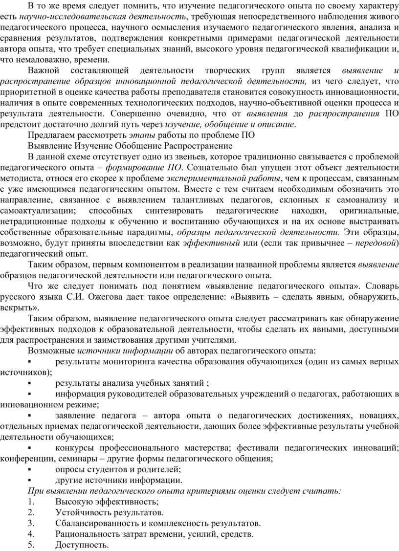 Важной составляющей деятельности творческих групп является выявление и распространение образцов инновационной педагогической деятельности, из чего следует, что приоритетной в оценке качества работы преподавателя становится совокупность инновационности, наличия в опыте современных технологических подходов, научно-объективной оценки процесса и результата деятельности. Совершенно очевидно, что от выявления до распространения ПО предстоит достаточно долгий путь через изучение, обобщение и описание.