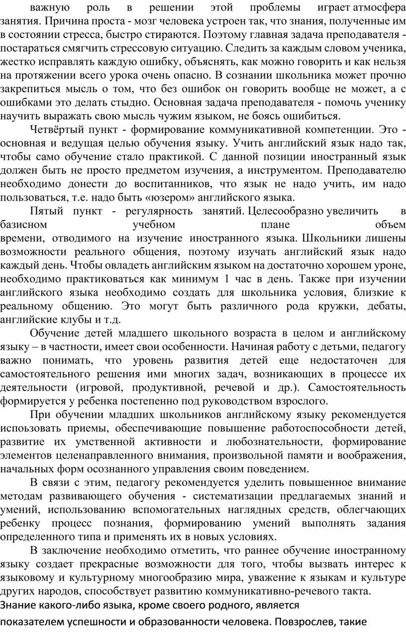 В любом случае, главная задача учителя начальной школы — завлечь, заинтересовать детей к изучению английского языка. Педагогу необходимо показать что это интересно, познавательно и главное, актуально. Учитель должен с детства вкладывать в головы воспитанников мысль о том, что что грамотность, широкий кругозор, образованность и всестороннее развитие очень важны для человека.
