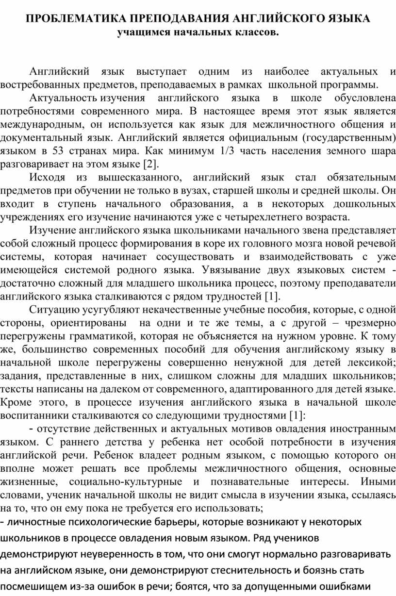 ПРОБЛЕМАТИКА ПРЕПОДАВАНИЯ АНГЛИЙСКОГО ЯЗЫКА учащимся начальных классов.