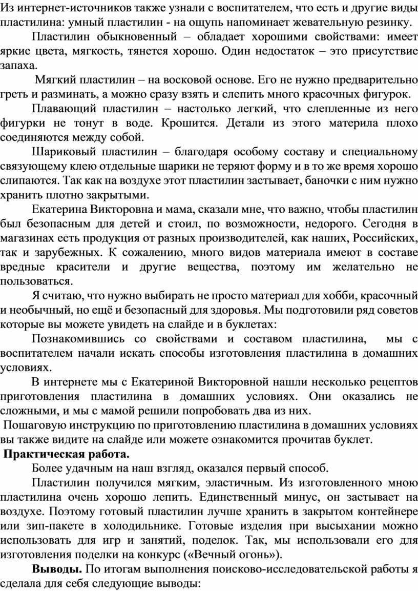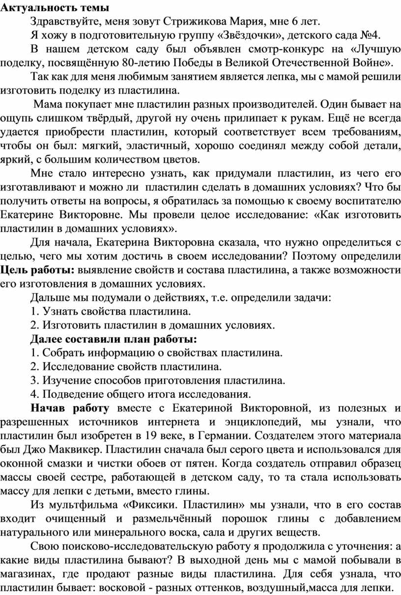 Мне стало интересно узнать, как придумали пластилин, из чего его изготавливают и можно ли пластилин сделать в домашних условиях? Что бы получить ответы на вопросы, я обратилась за помощью к своему воспитателю Екатерине Викторовне. Мы провели целое исследование: «Как изготовить пластилин в домашних условиях».