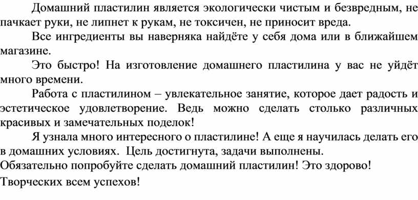 Домашний пластилин является экологически чистым и безвредным, не пачкает руки, не липнет к рукам, не токсичен, не приносит вреда.