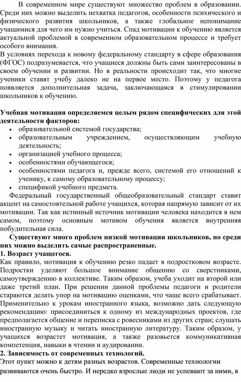 В современном мире существуют множество проблем в образовании. Среди них можно выделить нехватка педагогов, особенности психического и физического развития школьников, а также глобальное непонимание учащимися для чего им нужно учиться. Спад мотивации к обучению является актуальной проблемой в современном образовательном процессе и требует особого внимания.